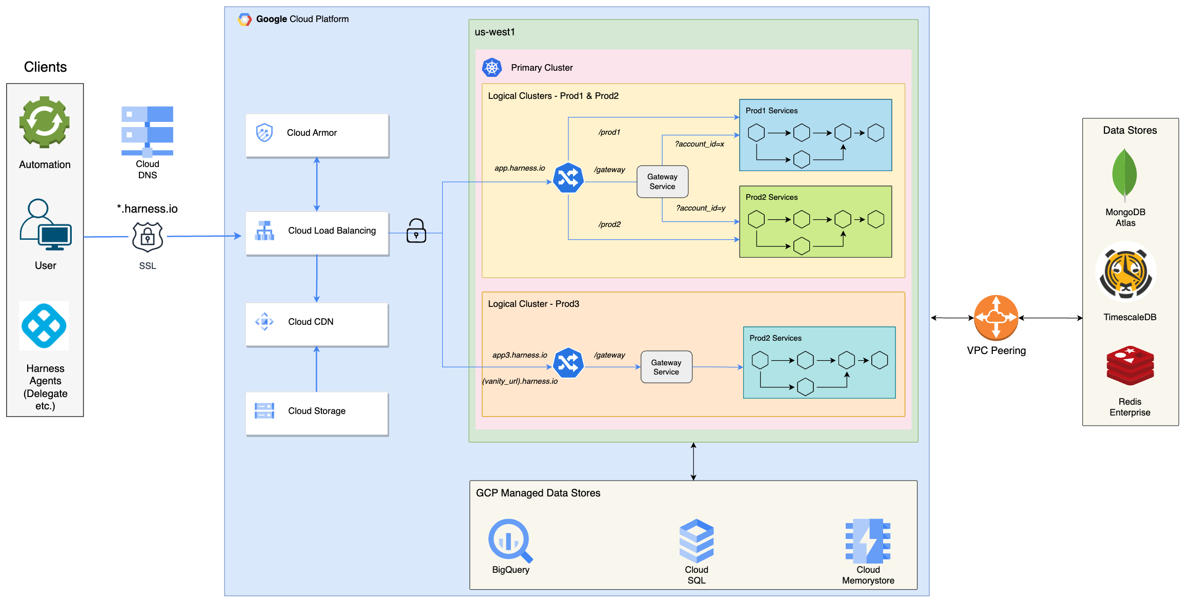 This diagram provides a detailed view of the primary cluster of the Harness SaaS platform. Clients, including automation tools, users, and Harness agents, make secure (SSL) requests to *.harness.io. Cloud DNS resolves this hostname to the GCLB IP address, which then routes the request to the appropriate backend: Cloud CDN (backed by Cloud Storage) for static content, delegate jars etc or the primary Kubernetes cluster in the us-west1 region.