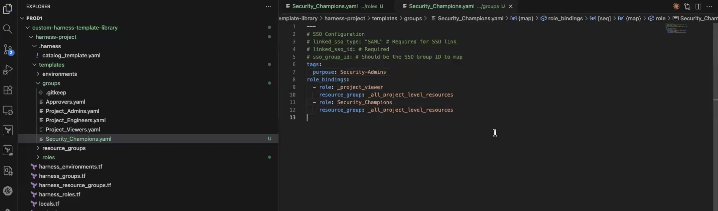 harness-project/templates/roles/Security_Champions.yaml - Sample permission sets are included under the