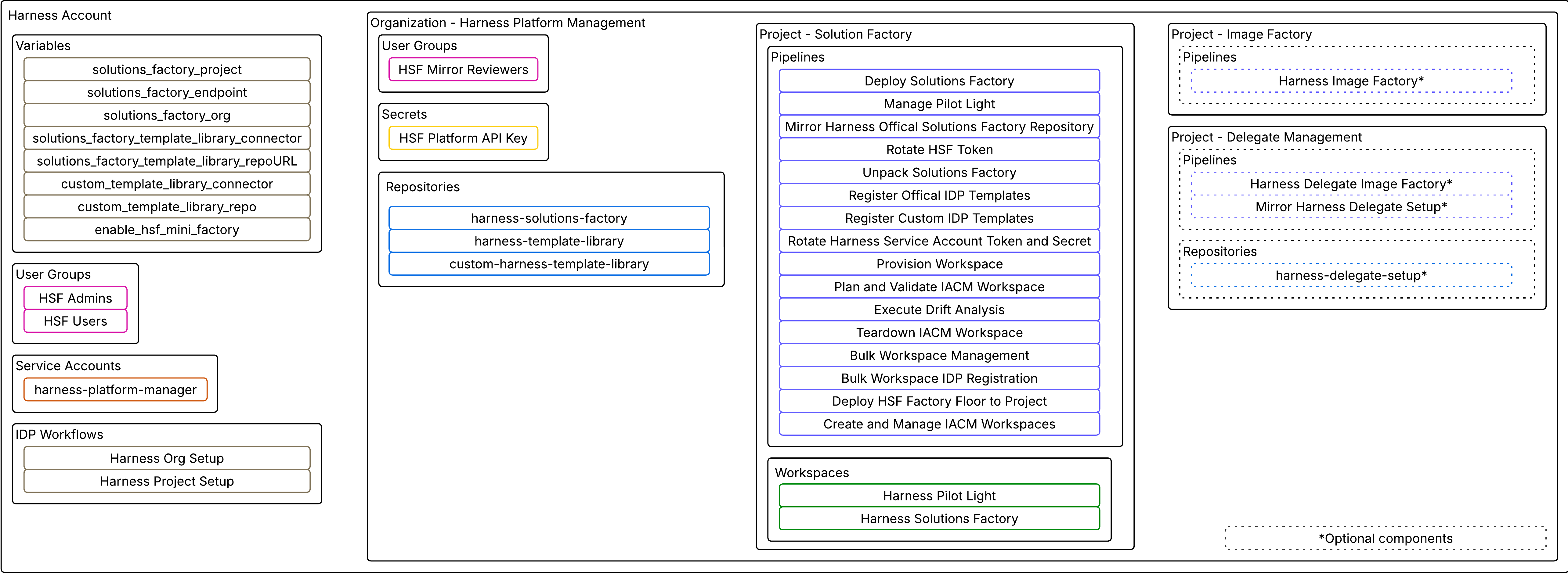 HSF is intentionally isolated into its own organization rather than placed inside an existing one so that platform-level management concerns stay separate from everything else in your Harness account. This also makes RBAC cleaner — HSF Admins can have org-admin rights scoped to this organization.