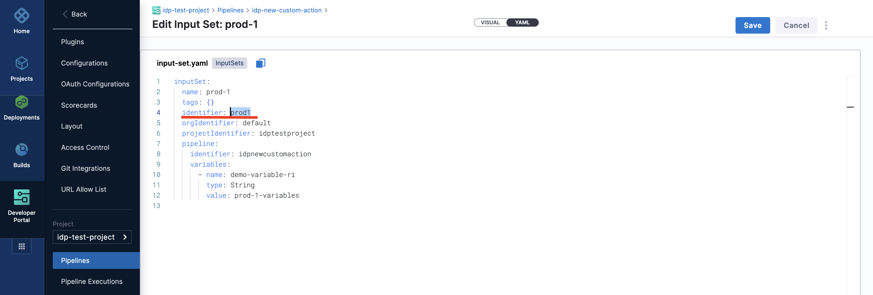 Developers need to mention the input set identifier instead of the name in the workflows input, usually identifier are names devoid of any special characters and spaces, e.g., input set-test name would have an identifier as inputsettest. It is suggested to provide all the available input-set as enums in the template to avoid any ambiguity by developers.