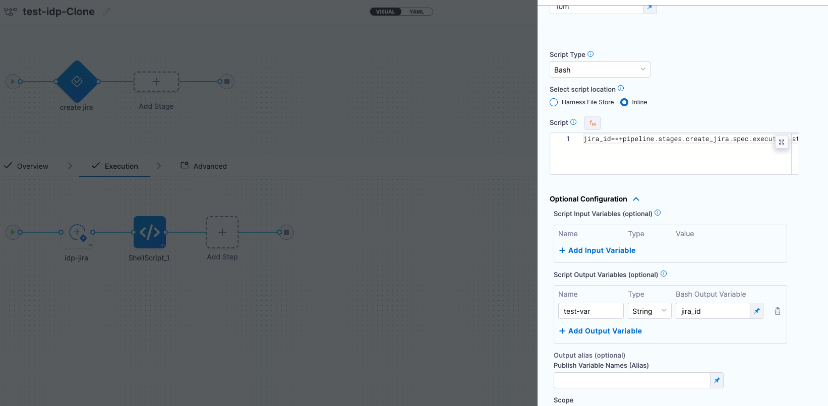 Only user defined output variables are allowed, but you can as well use the system generated variables by assigning them as a new variable under shell script step as displayed below. For e.g. we have mentioned the system generated output as jira_id and under Optional Configuration added a test-var which becomes a user defined output variable and could be displayed as output in the IDP workflows.