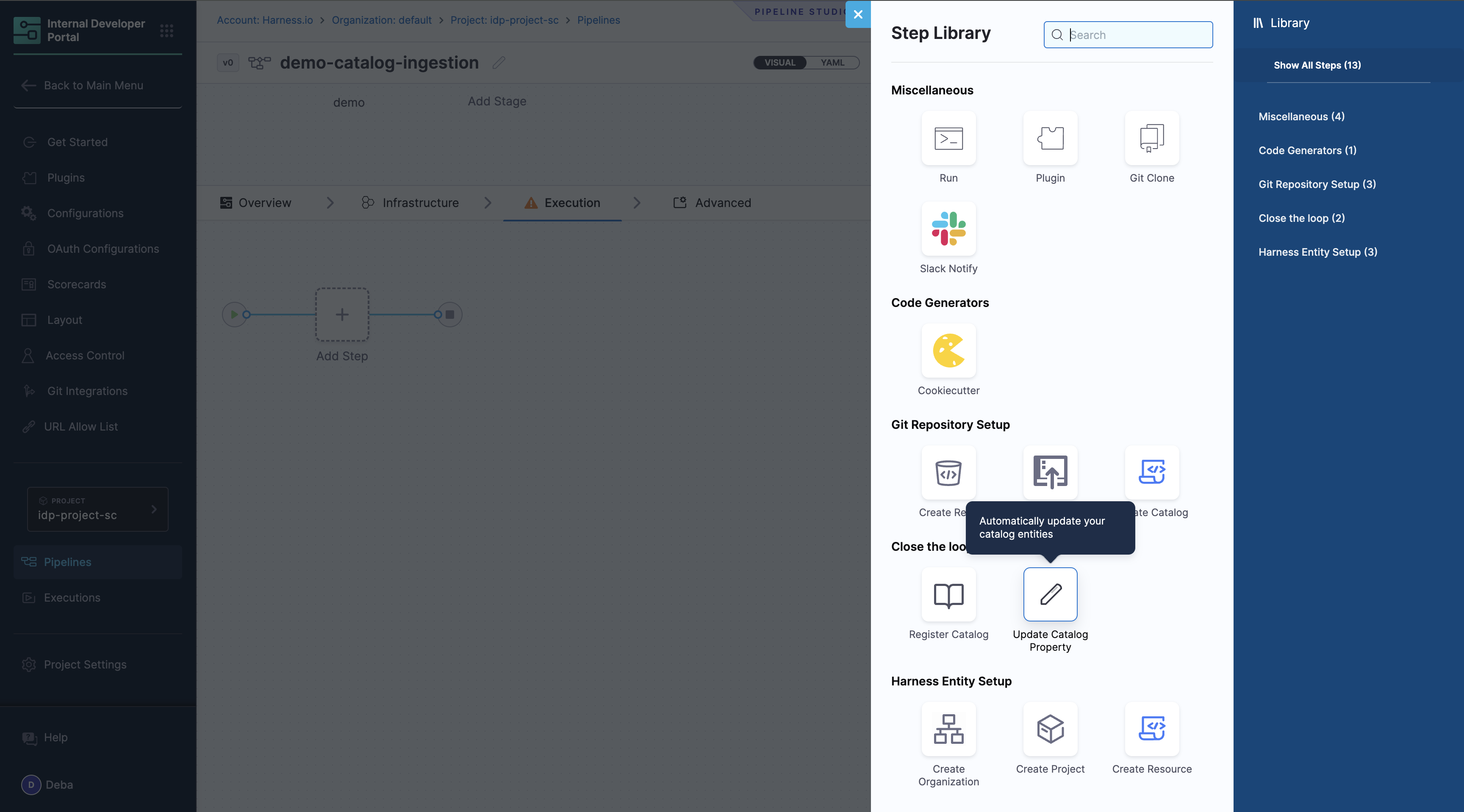 cookieCutter: Used to take inputs for the cookiecutter template.createRepo: Used to create the repository in your git providerdirectPush: Used to push the service/application created using Cookiecutter step along with the catalog-info.yaml in the repo you created in previous step.registerCatalog: Used to register the software component created in the Harness IDP Catalog.slackNotify: Used to notify individual developers once the pipeline is executed successfully and your Software component is registered successfully in your Software Catalog.createResource: Used to create Harness entities like projects, users, connectors, pipelines, secrets, etc.updateCatalogProperty: Used to update the catalog metadata for your entitiescreateOrganisationcreateProjectcreateCatalog