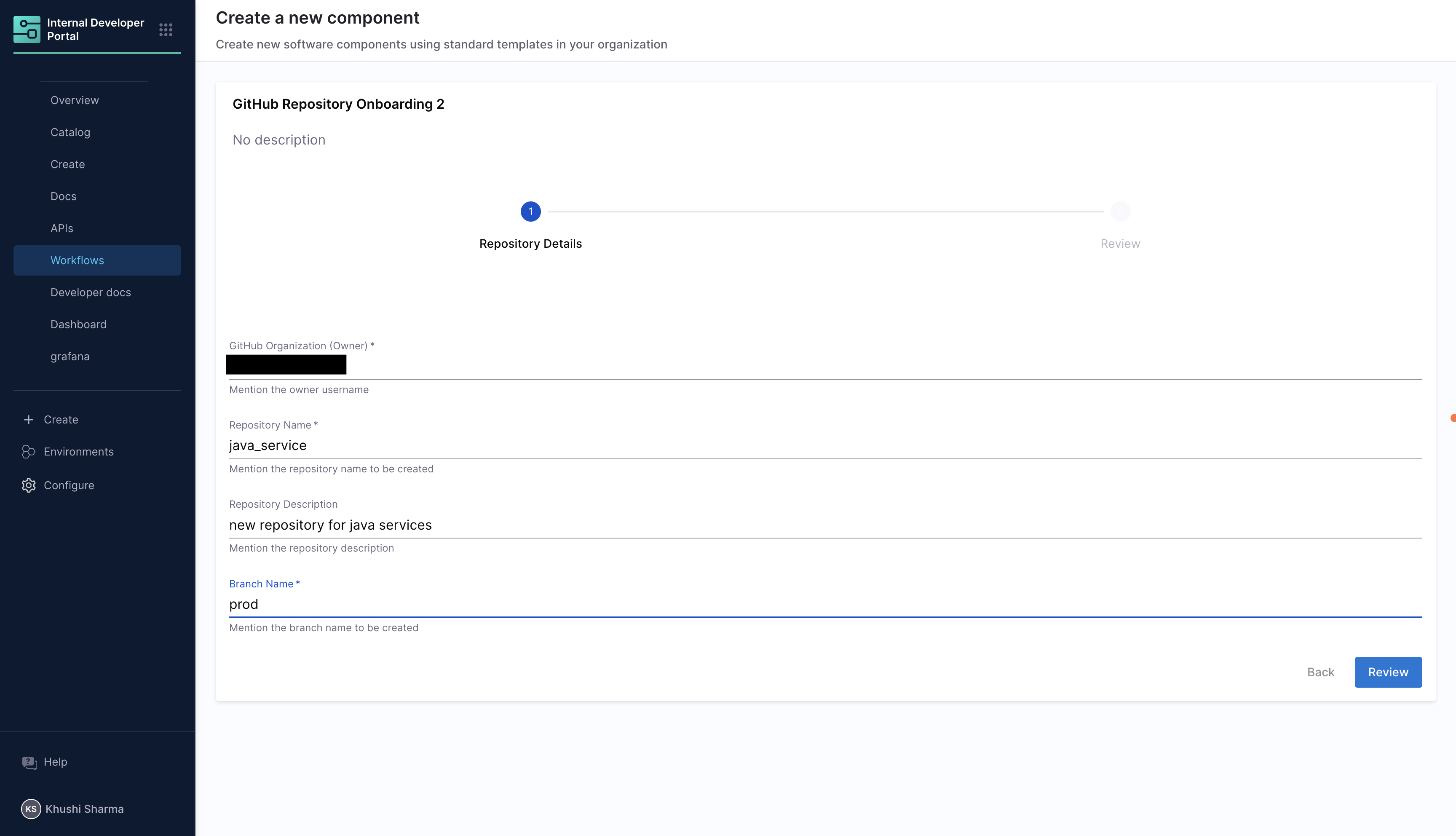 The Workflow provides a user-friendly interface where developers input the following details and can create a repository without any intervention and runs the above orchestration pipeline in backend to execute the final actions of the Workflow. The Workflow includes validation to ensure proper input format and triggers the above pipeline execution to ensure all the steps are executed successfully.