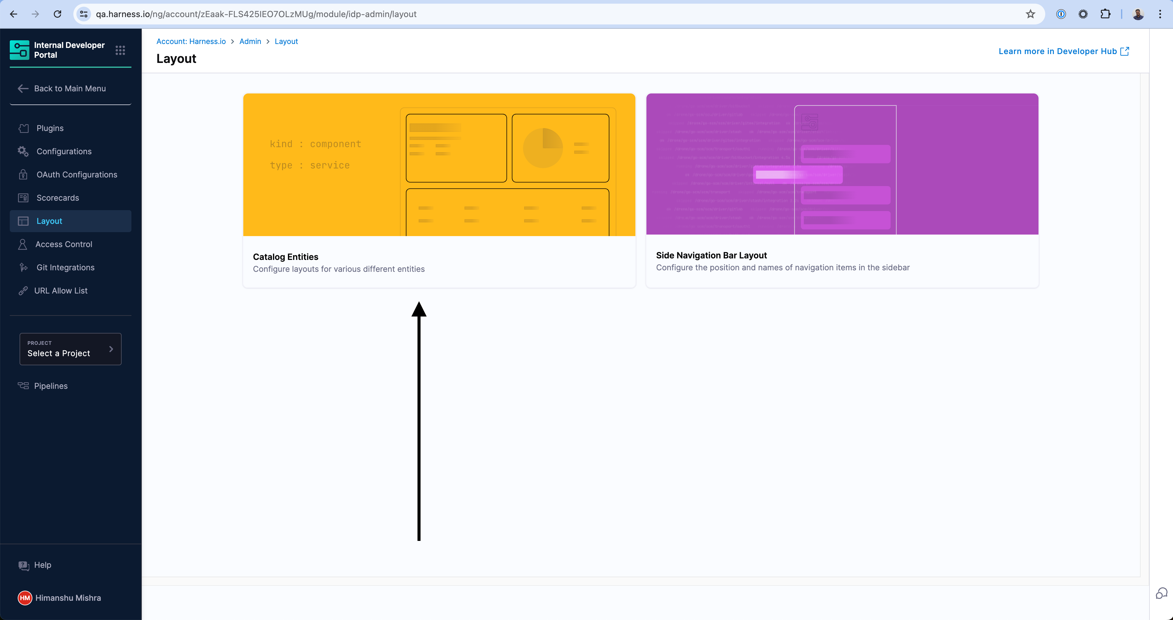 - Go to the Layout Page and under Admin and select Catalog Entities.