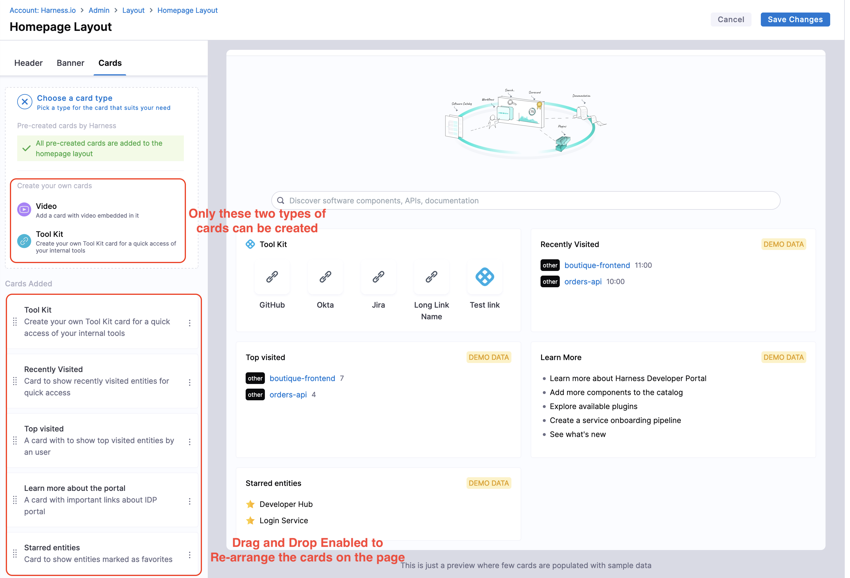 The Platform Admins can customize the homepage under Layouts for 3 different categories Header, Banner and Cards. A preview of the changes with sample data is available while customizing the homepage. The cards can be of two width sizes, i.e., medium(6md) and large(12md).
