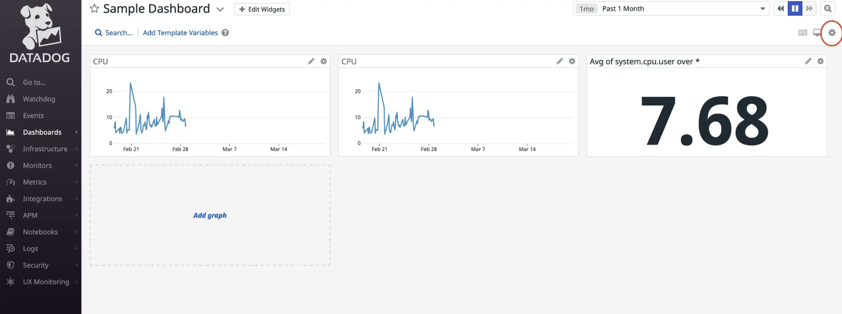 Within the chosen dashboard, click the Settings cog on the right-hand side of the screen, circled in red.