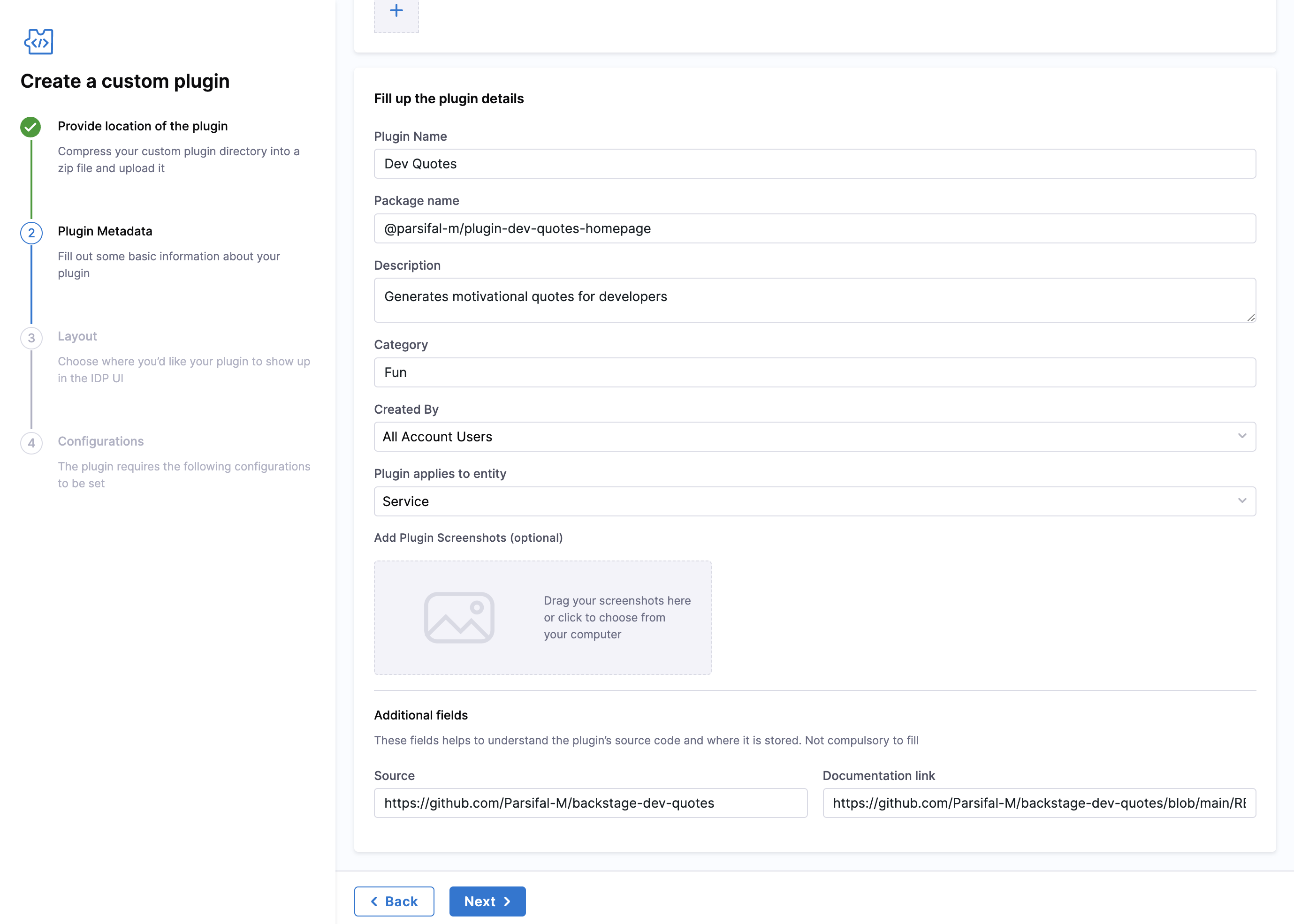 Now Click Next and start adding the Plugin Metadata. You have to fill the following fields