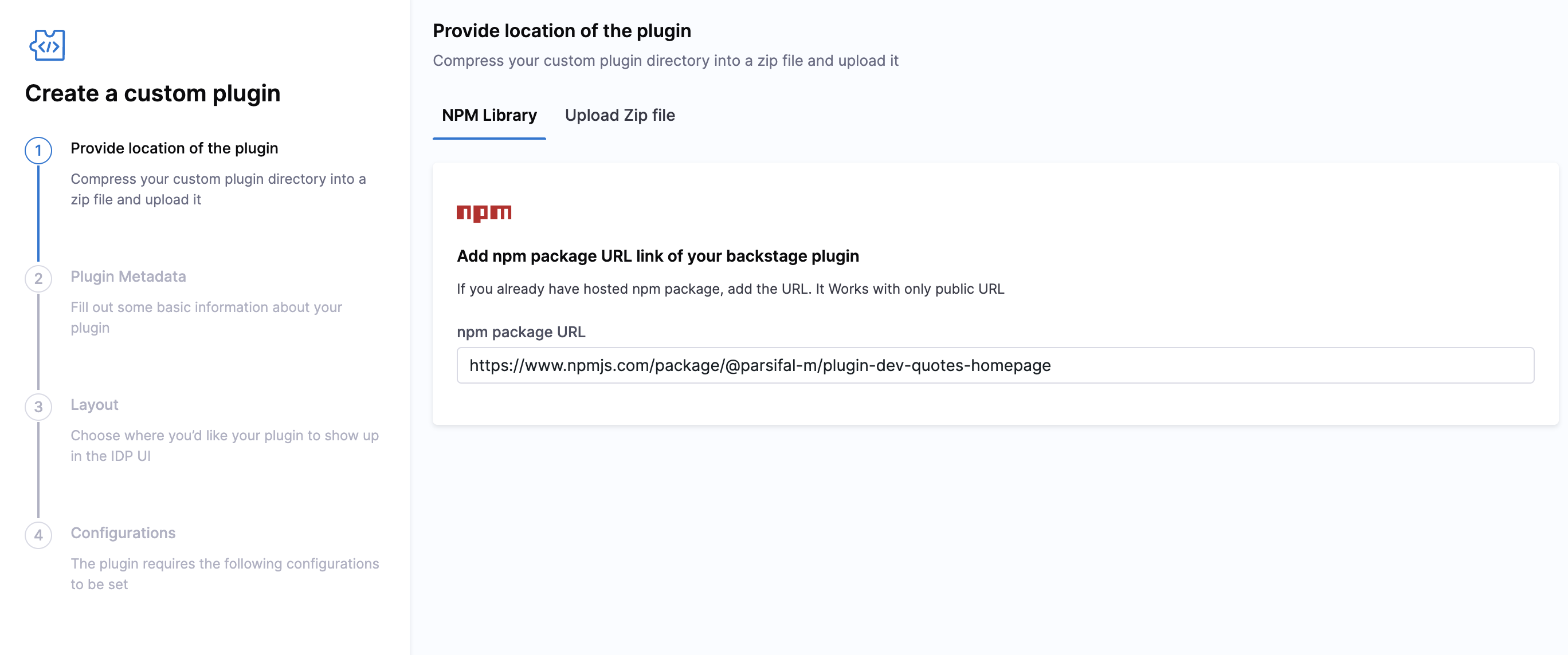 - Now add the URL for your plugin public npm package.