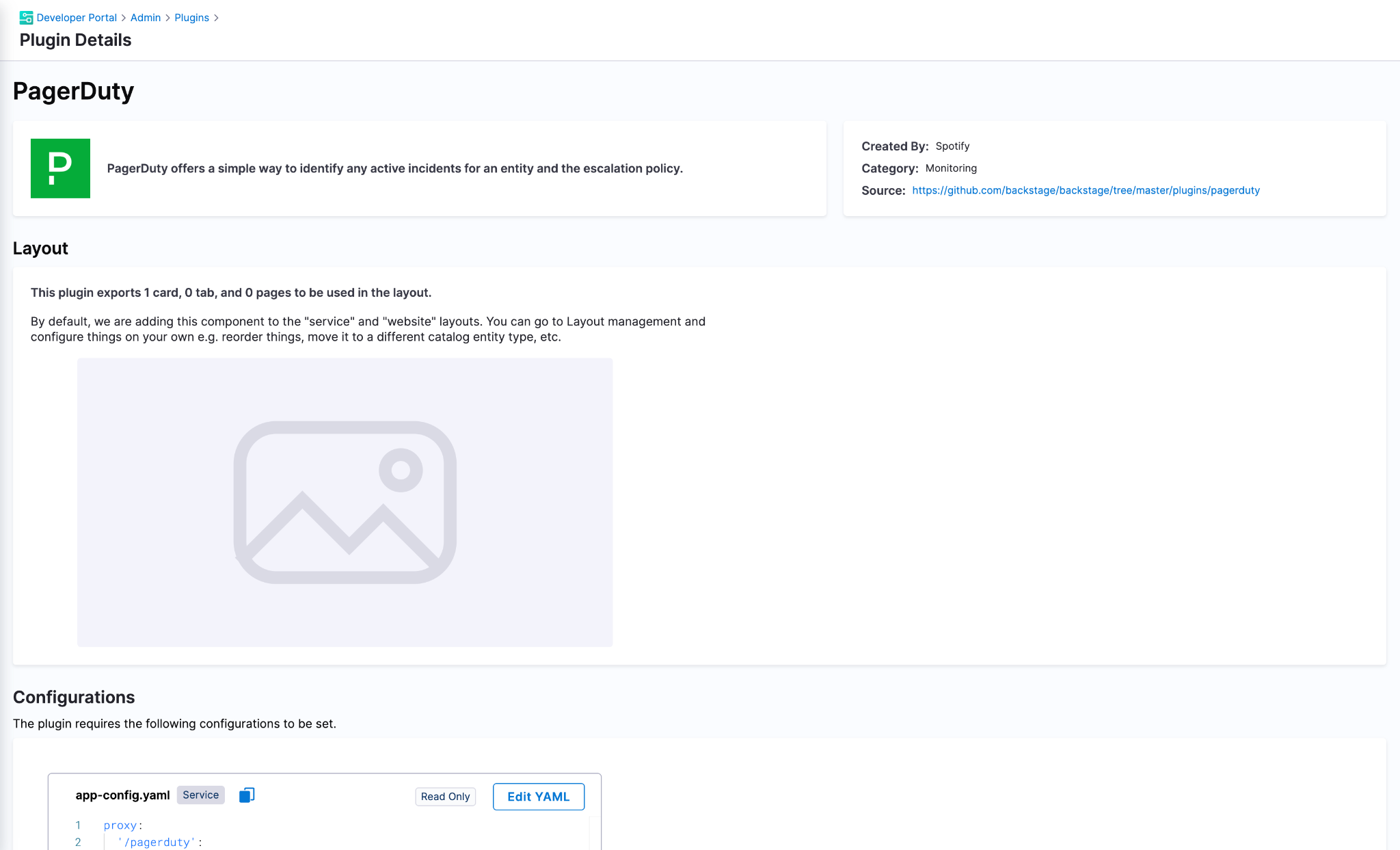 For instance, if the PagerDuty plugin exports one tab, in order to be displayed in your catalog entity, the layout is updated with elements as displayed below.