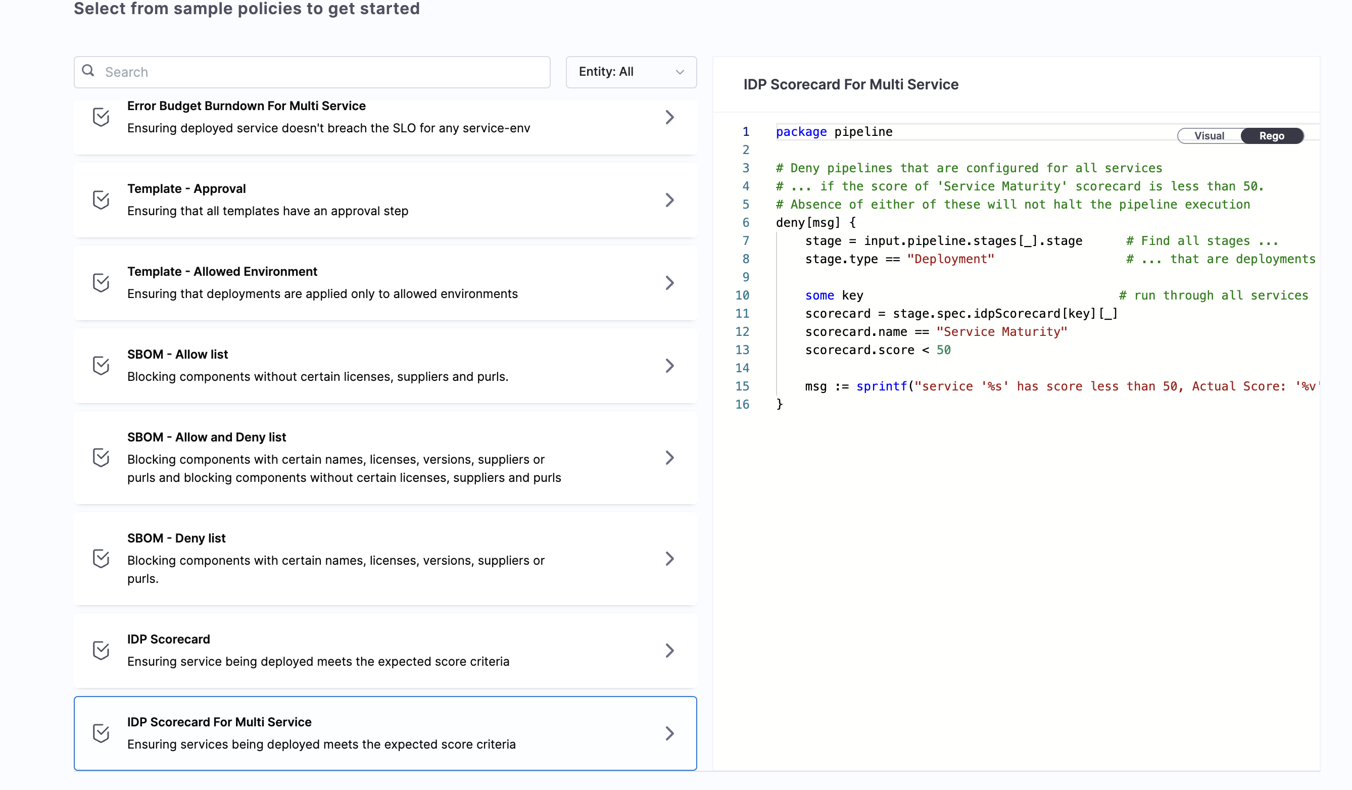This policy enforces that all services used in a pipeline must have a scorecard score above a specified threshold (e.g., 50) before deployment.