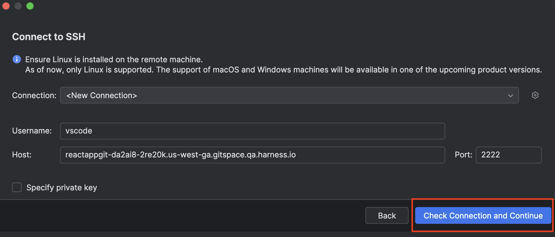 - Add your SSH key and configure the required Gitspace specifications.
