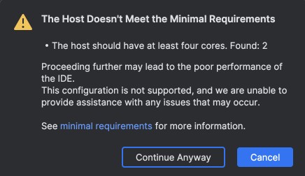 If your Gitspace does not meet the recommended requirements, the following warning may appear during your PyCharm setup. You can choose to create a new Gitspace that adheres to the recommended specifications or proceed with your existing configuration.