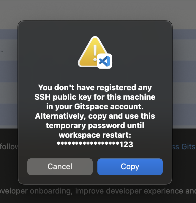 To establish this remote connection, a temporary password will be generated automatically. After the Gitspace is created, you'll be prompted to copy the temporary password. Paste it and follow the prompts to establish the remote connection.