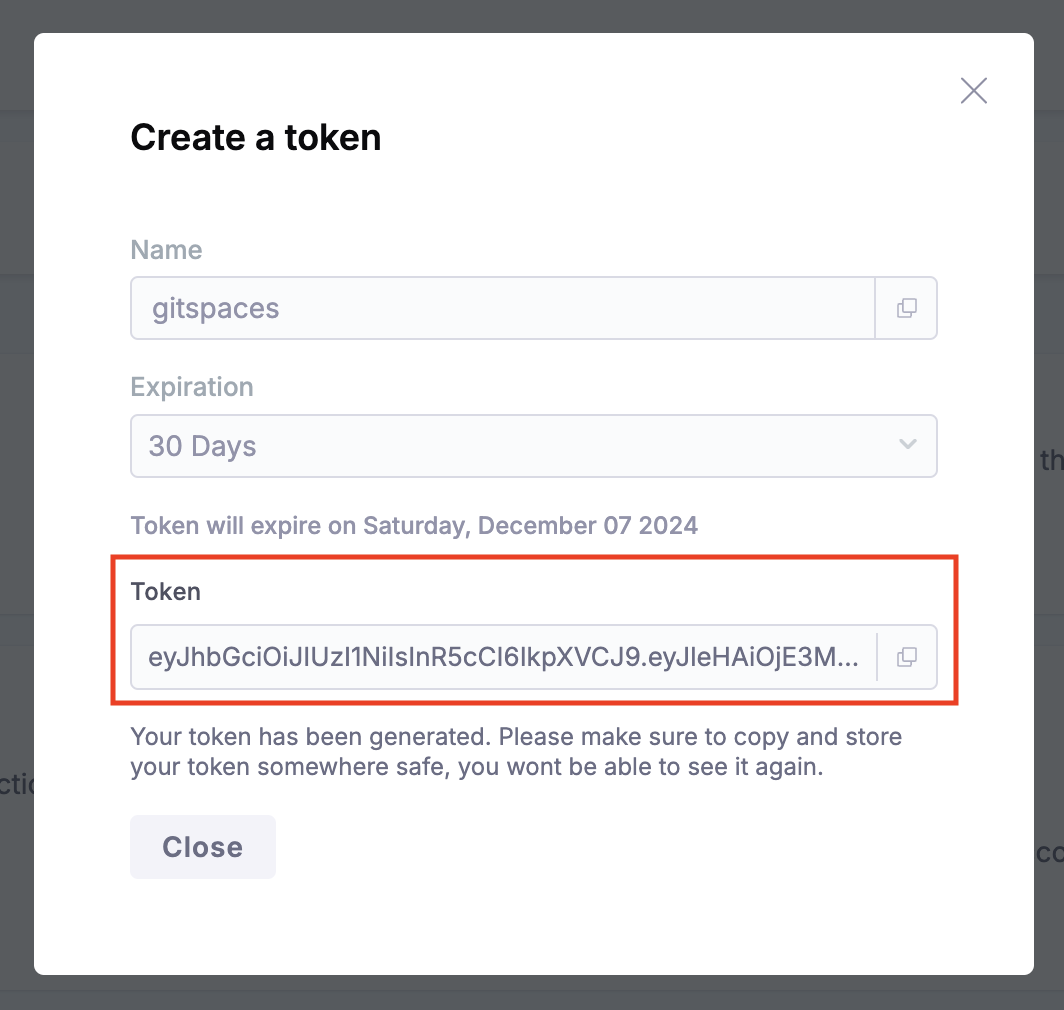 From there, create a new token by giving it a name and setting its expiration. Once created, copy the token from the provided box. Please ensure you store this token securely, as you will not be able to view it again.