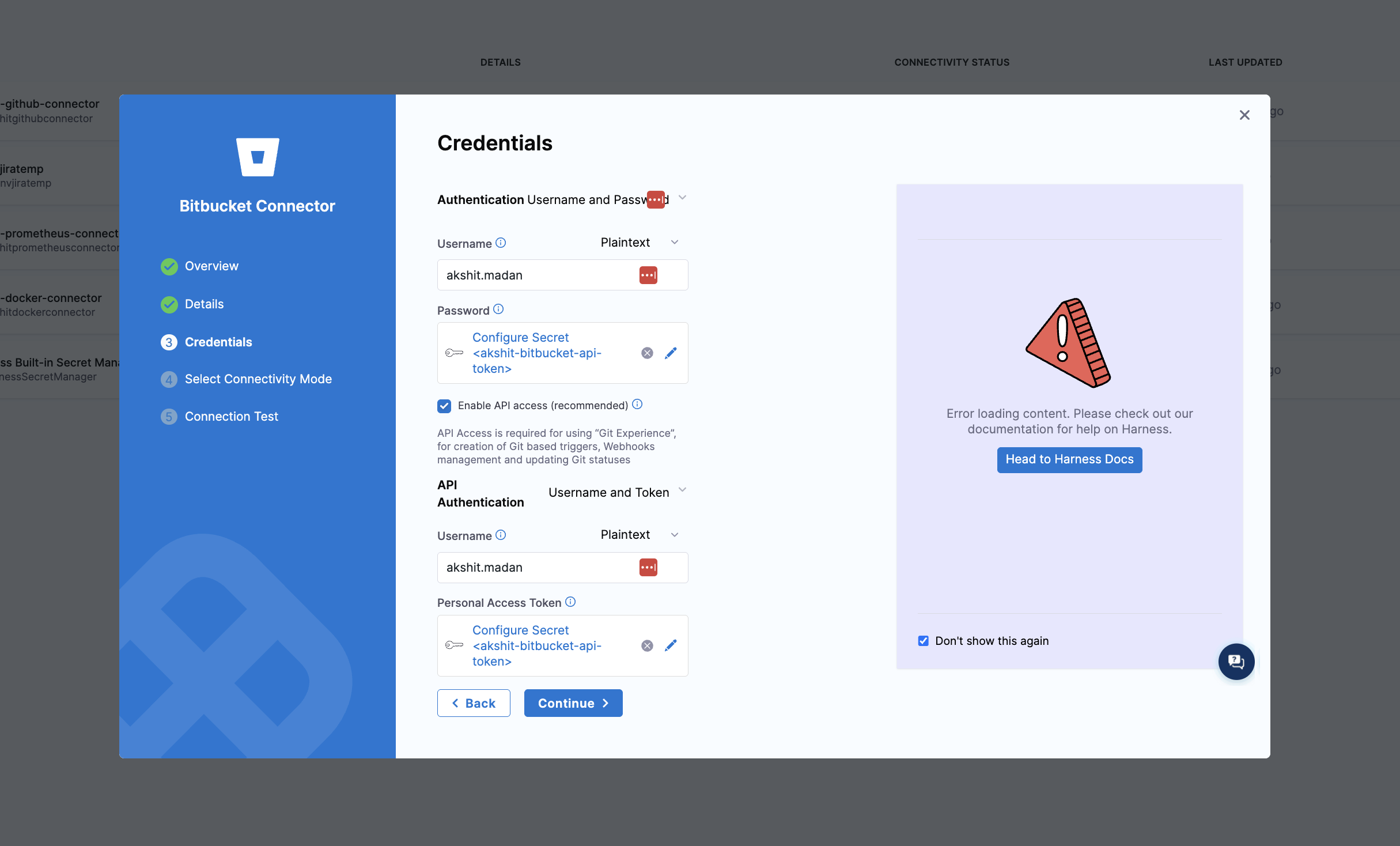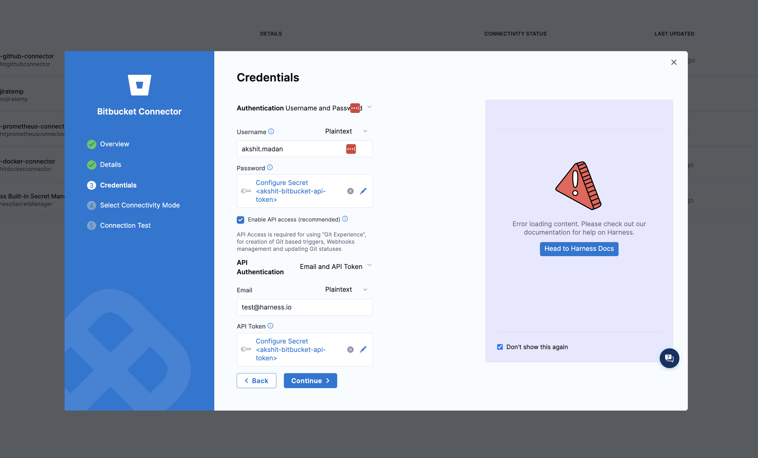 Access tokens are linked to your Bitbucket repository, project, or workspace. While creating the Bitbucket connector, you get an option to select the access token method for API Authentication.