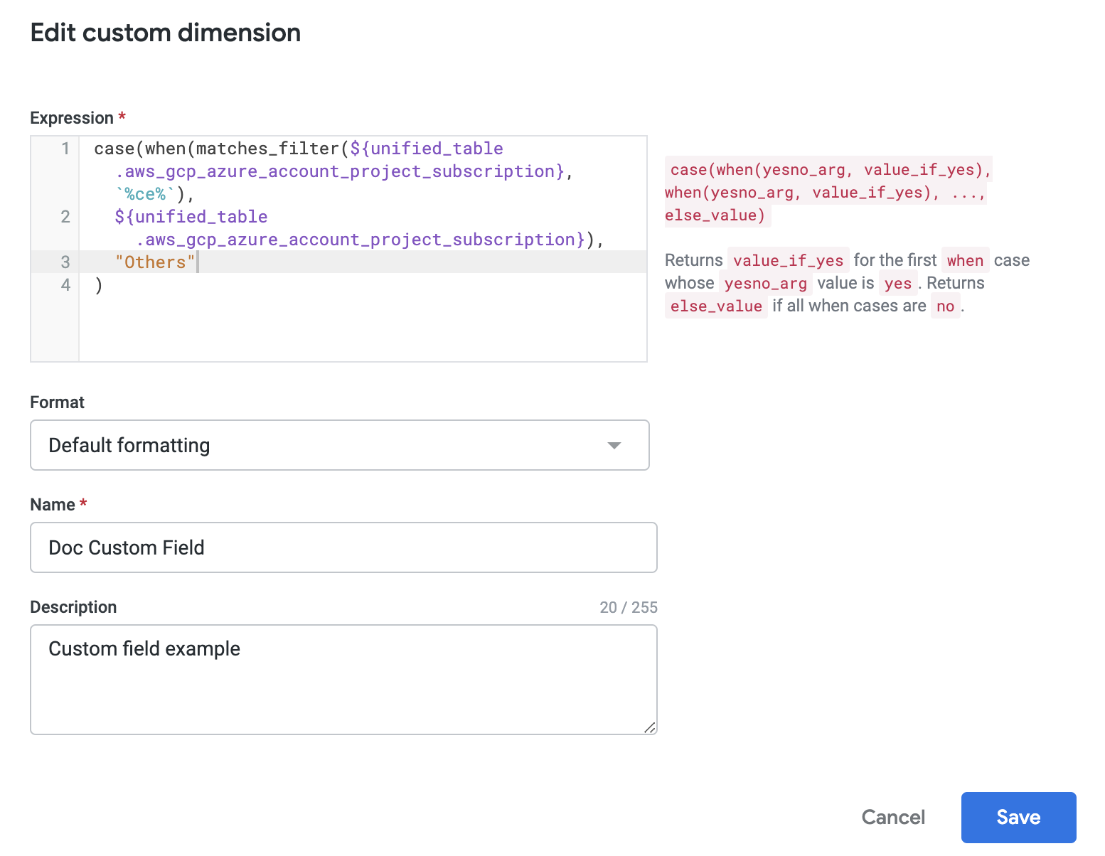 - In Edit custom dimension, in Expression, enter the expression for your dimension. For supported functions and operators, go to Functions and operators.