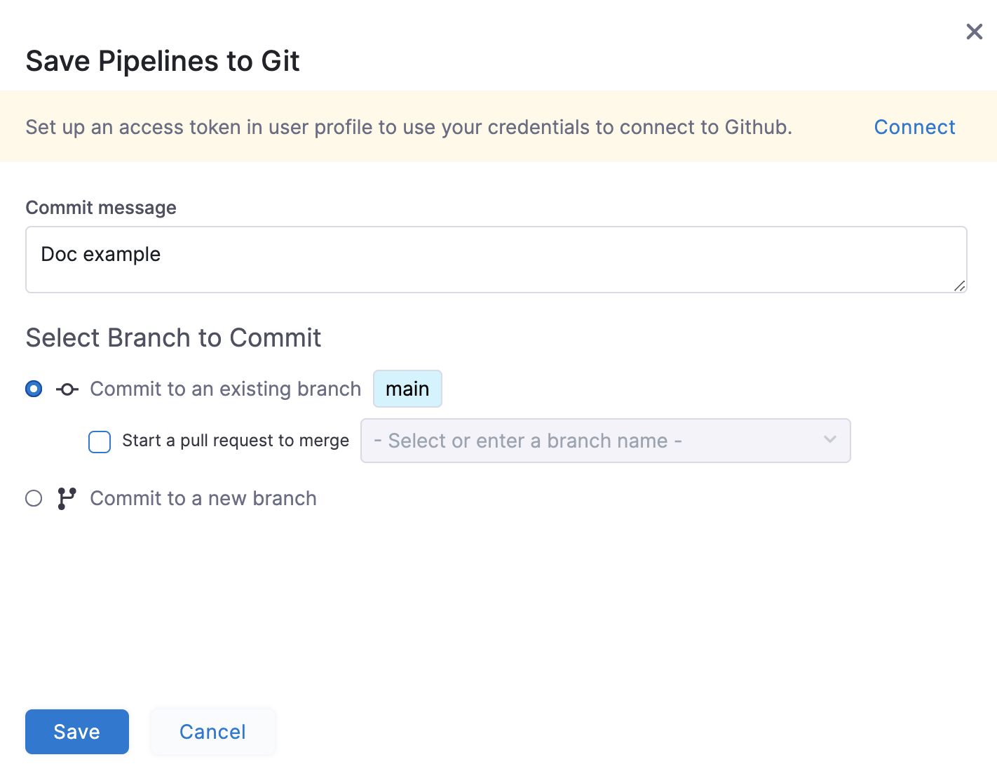 importantIf you have not configured OAuth for Git, Harness prompts you to set up an access token in the user profile to use for Git commits. You can do one of the following to commit your changes to Git: