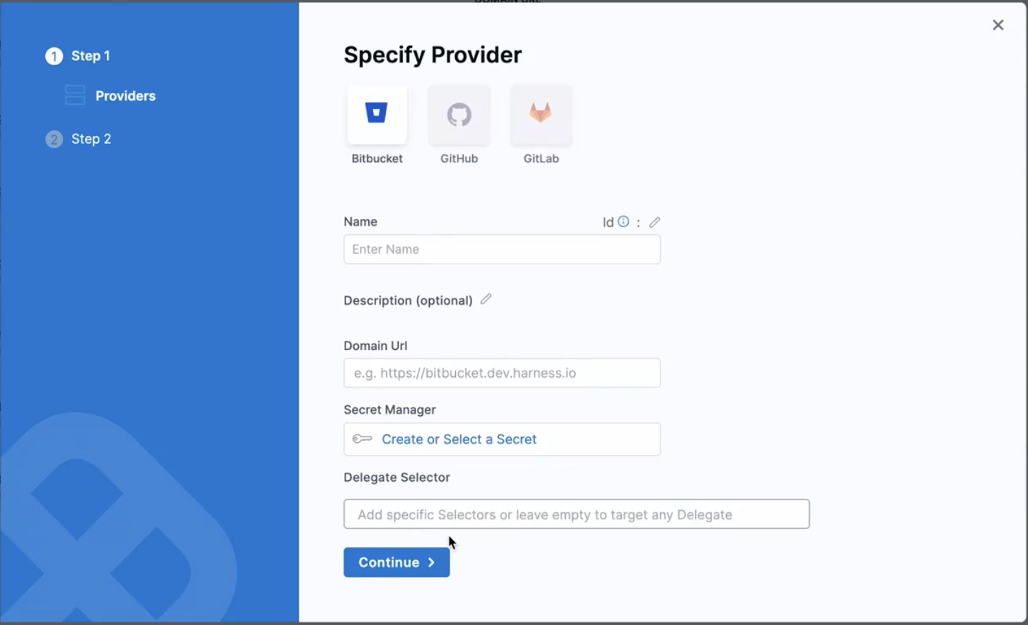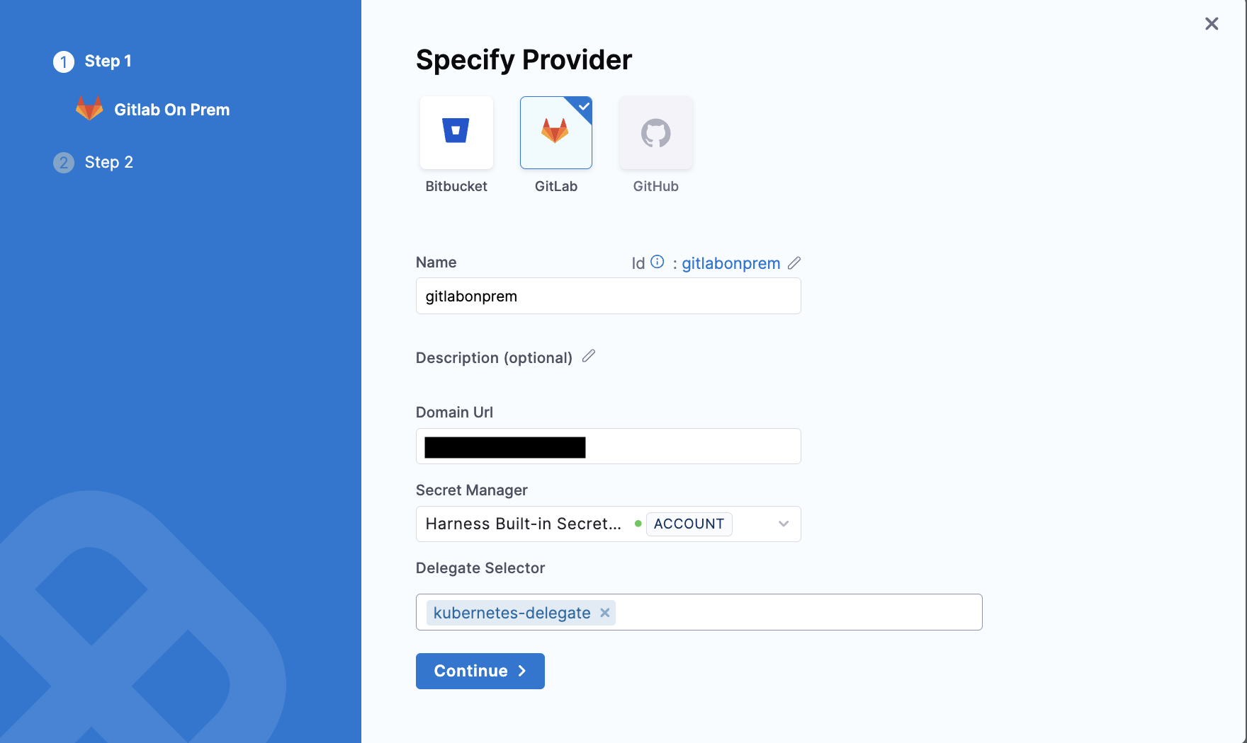 - Specify the Delegate Selector. Click on continue.