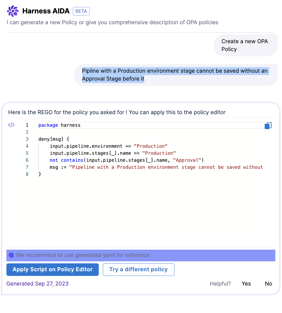 Create OPA Policies: Harness AI helps you get started and write OPA Policies based on pipelines, connectors, and templates, and other Harness objects with no need to understand the nuances of REGO (Open Policy Agent language).