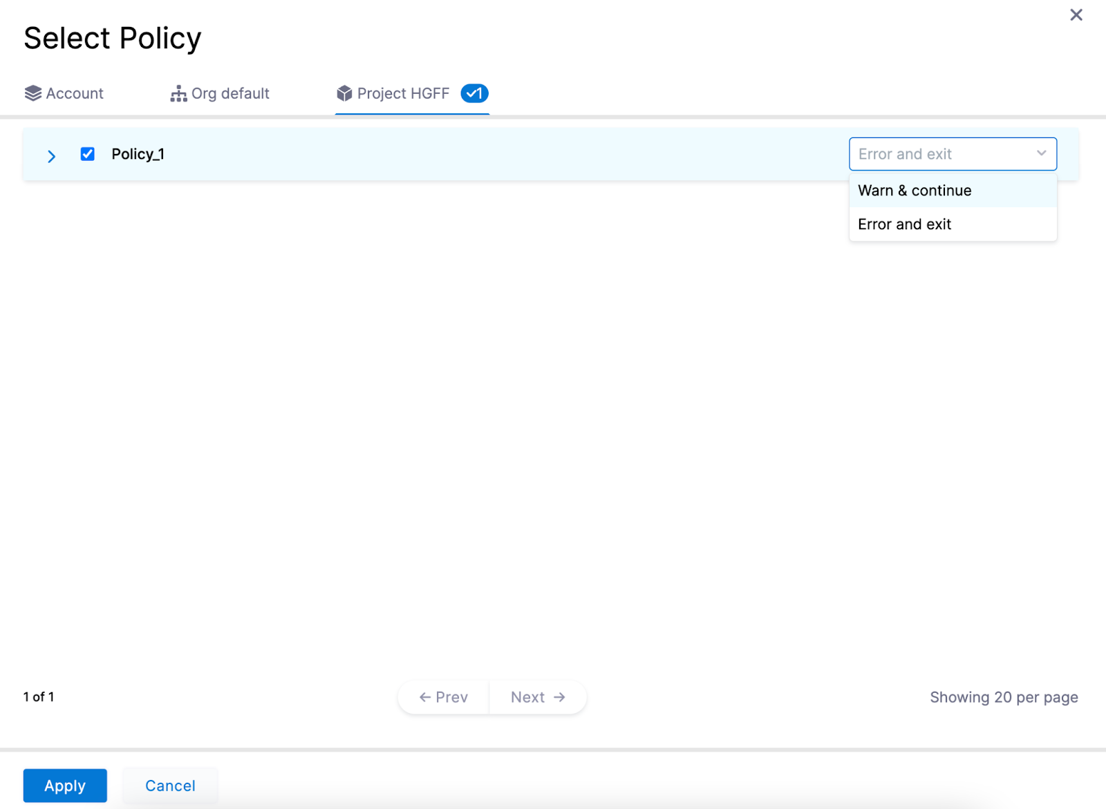 - Select the policy you want to use. In the drop down menu next to the policy name, select the severity and action you want to apply when the policy isn’t adhered to:
