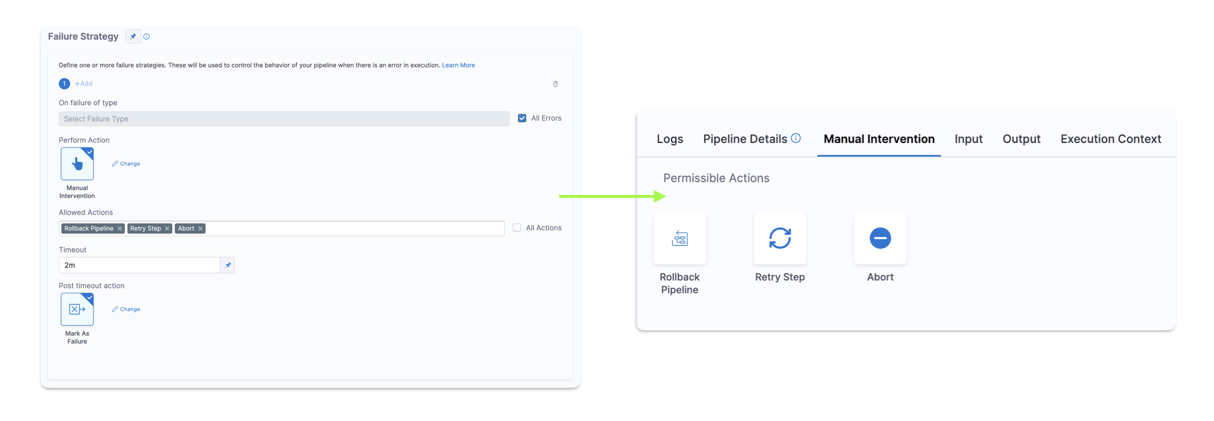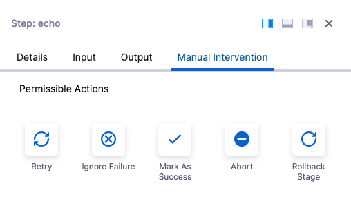 You can now restrict the set of available actions shown to the pipeline executor during a manual intervention. This applies when a step or stage fails and the configured Failure Strategy is Manual Intervention.