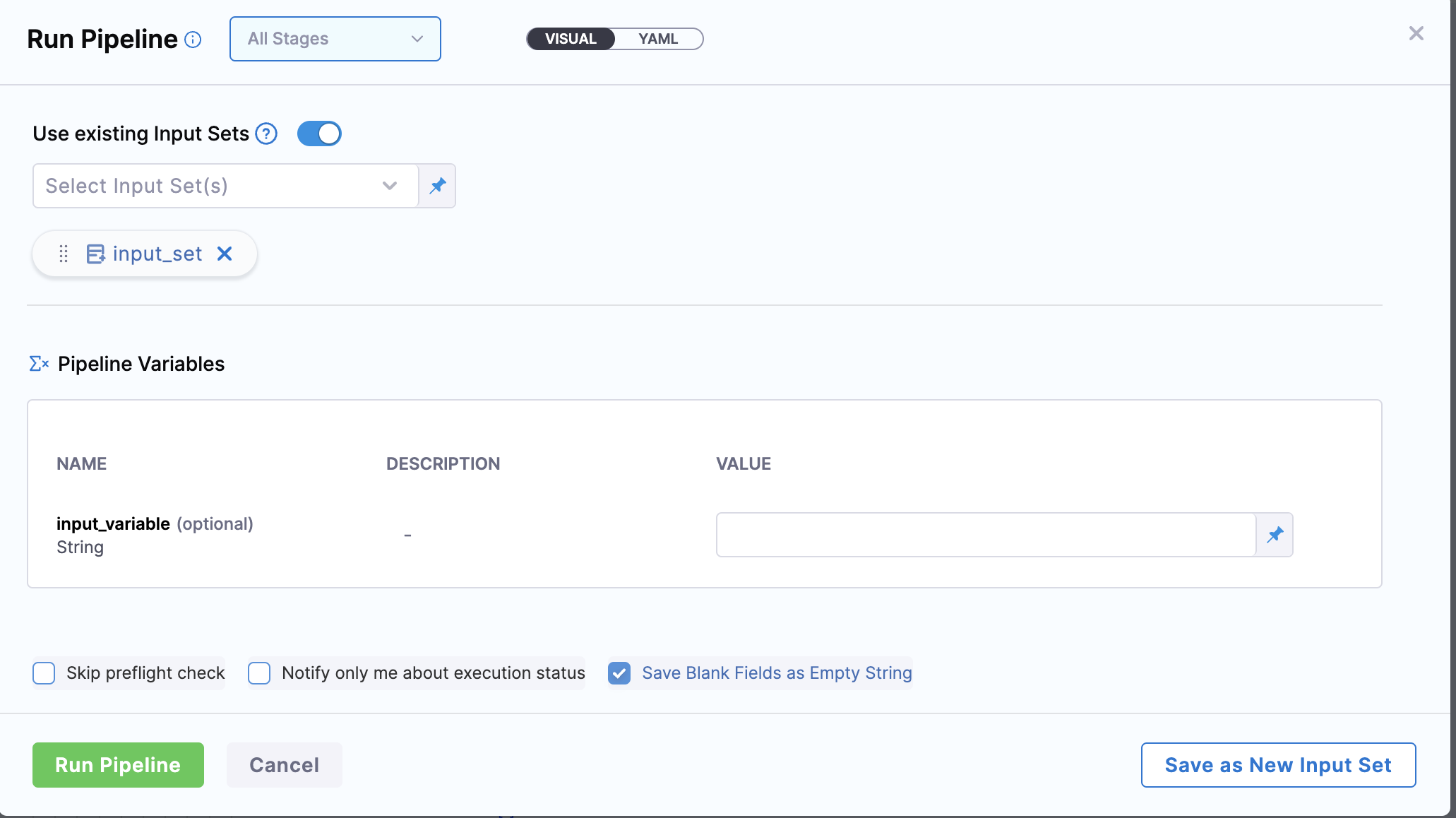 - Show checkbox to Save Blank Fields as Empty String: When enabled, this setting shows the checkbox Save Blank Fields as Empty String both when creating the input set in the Input Set section and when creating an input set in triggers, as well as in the Pipeline Run form.