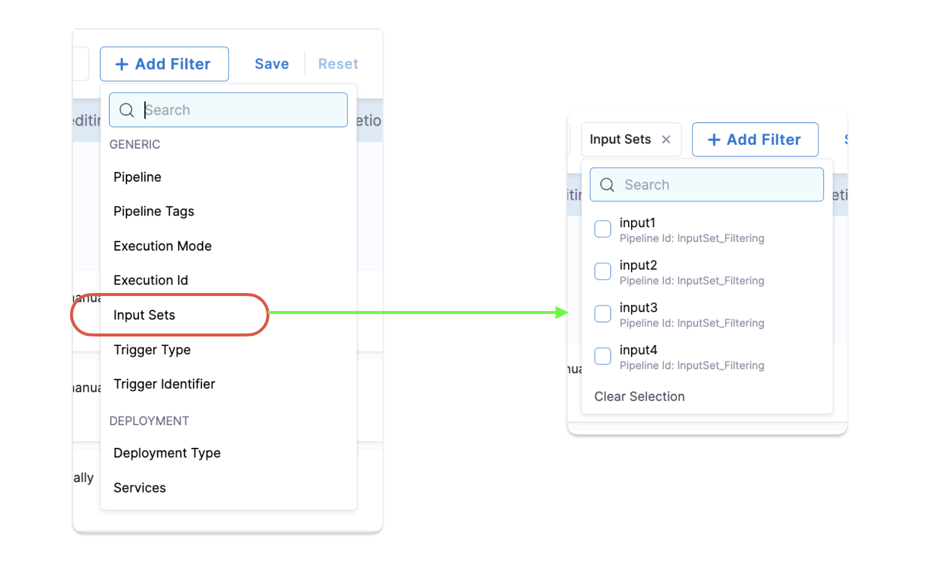 - You can filter pipeline executions by input set name using the Search filter in the Execution History page.