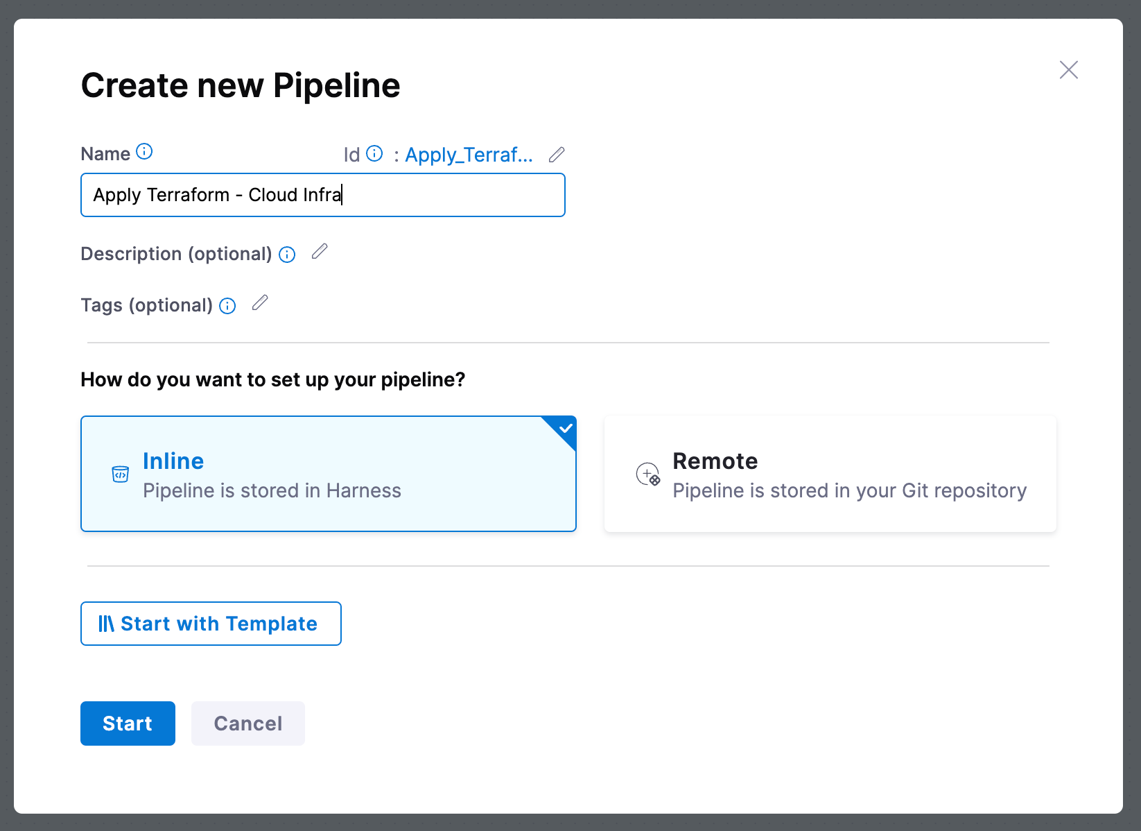 The following is an example of creating the above IaCM workspace using the Harness Terraform provider.