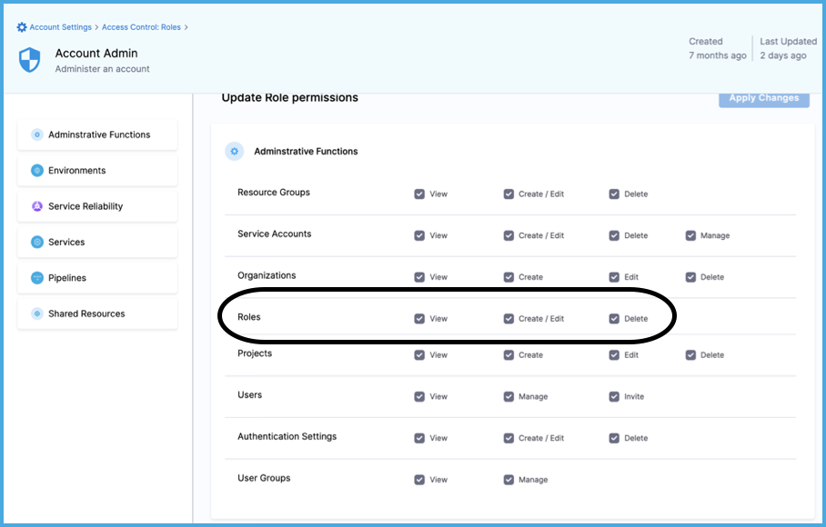 Harness includes several built-in roles. To examine the permissions assigned to these roles, view them in Harness: