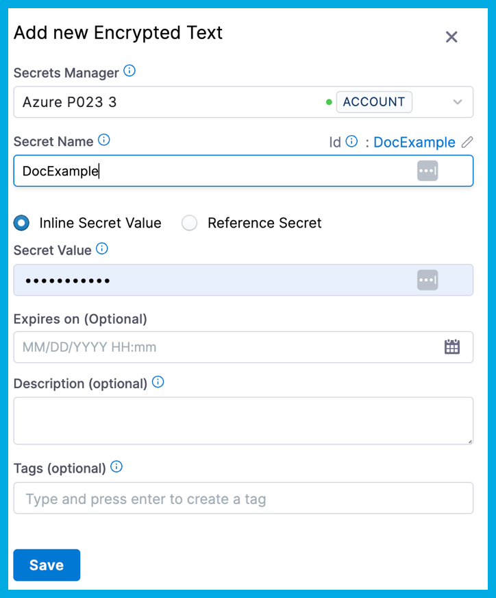 - Inline Secret Value: Enter the value for the encrypted text. If your secret is managed by Azure Key Vault, you can set an expiry date in Expires on. The Harness Delegate version 79306 is required for this feature.