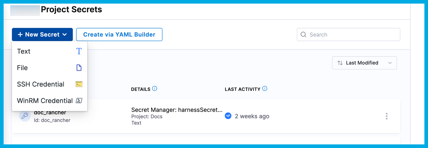 infoYou can create secrets that point to secret managers in a different scope. For example, you can create secrets inside a project using the Secret Manager created at the Org or Account level.