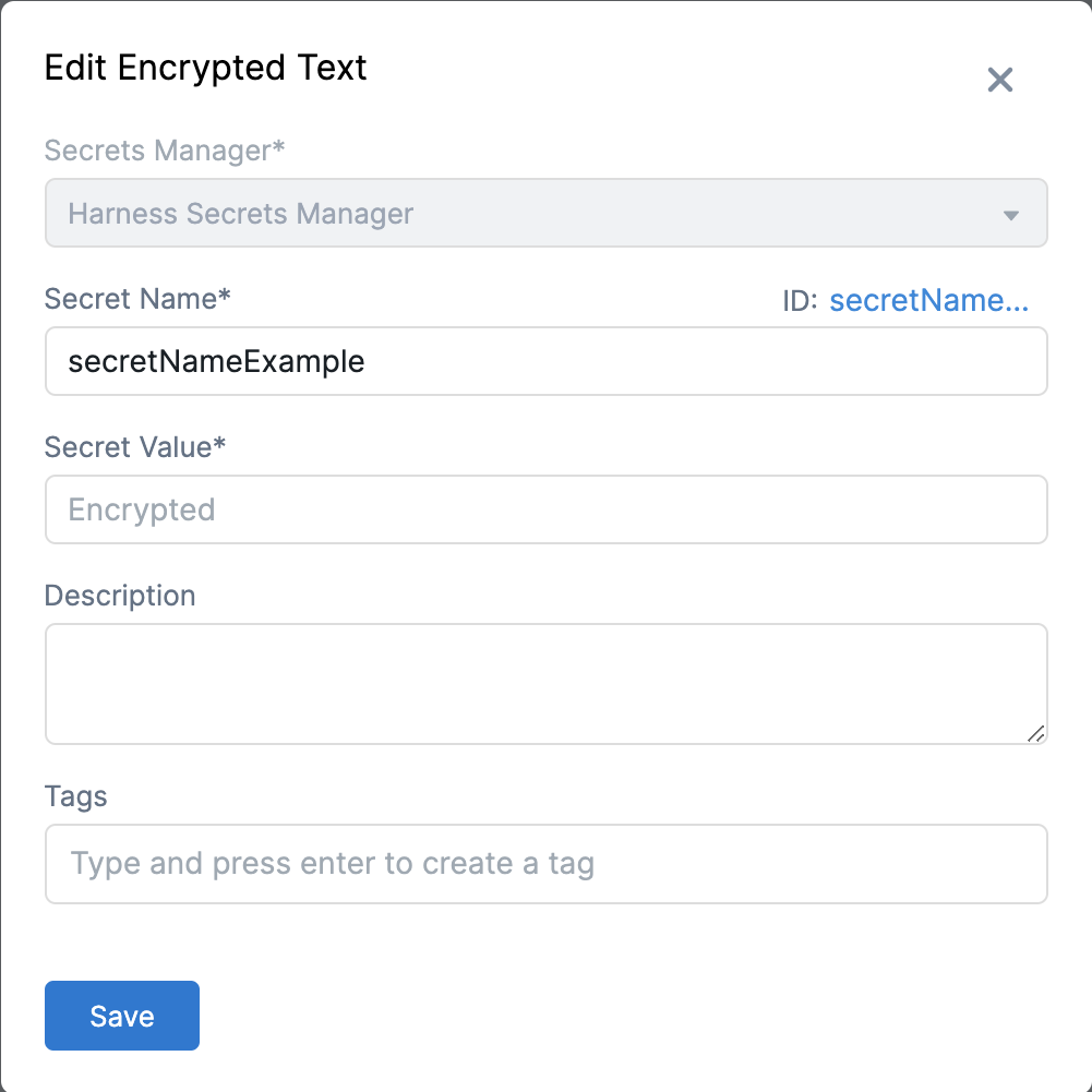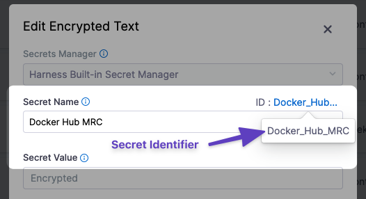 Harness automatically creates an Id based on the name. You can use the Secret Name and Id to reference this secret elsewhere in Harness.