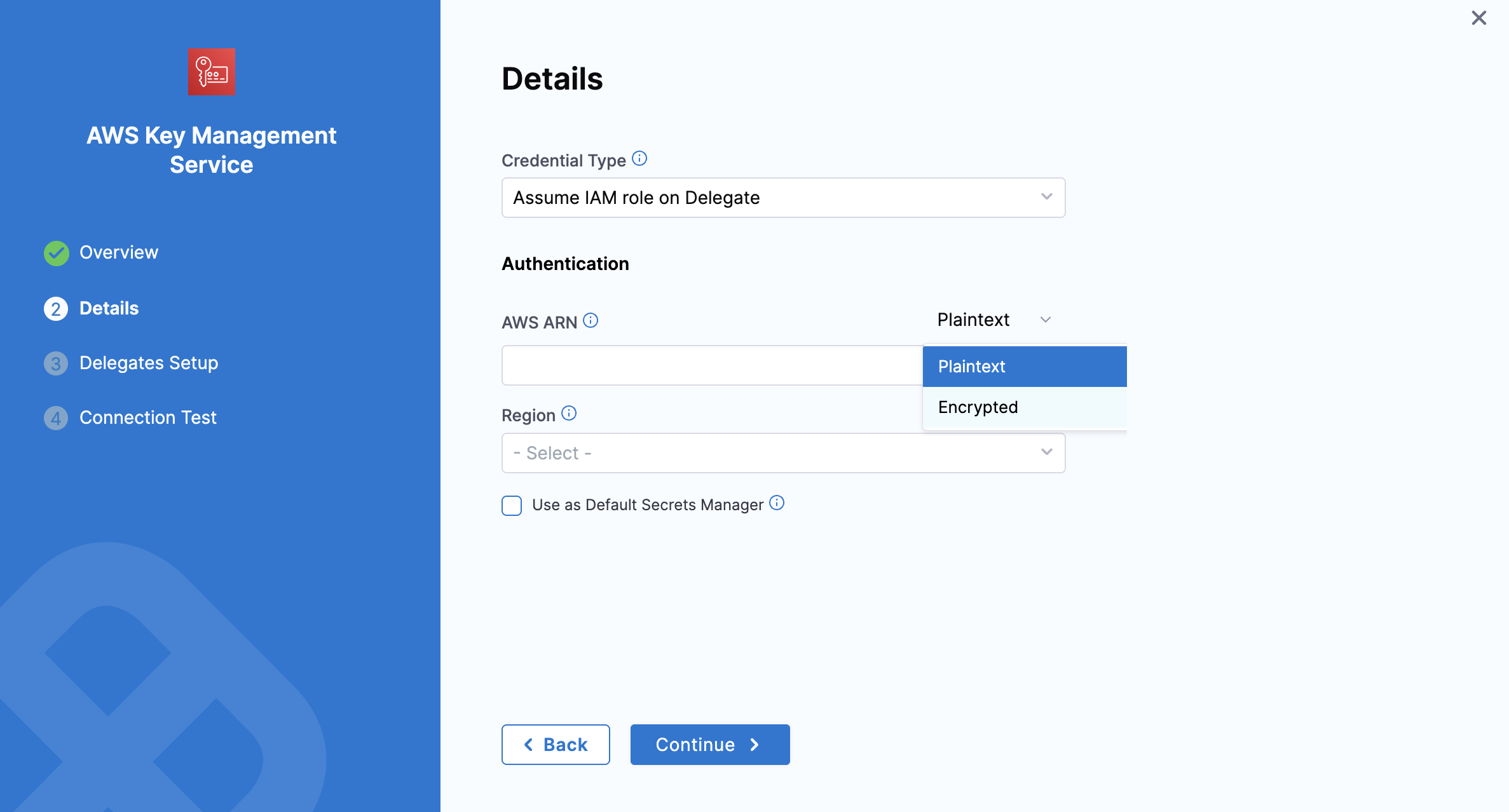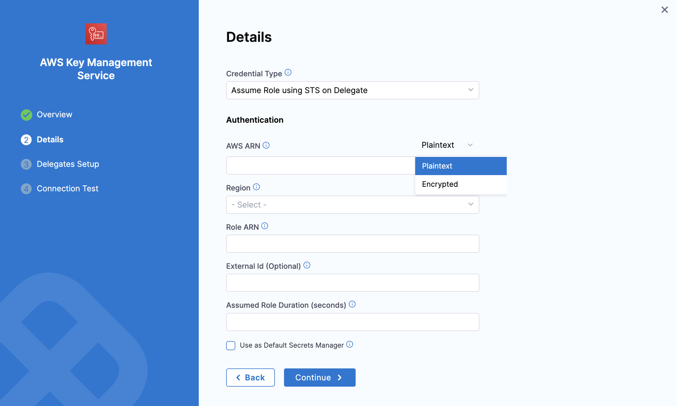 AWS ARN: You can provide the AWS ARN as plain text or as an encrypted secret.