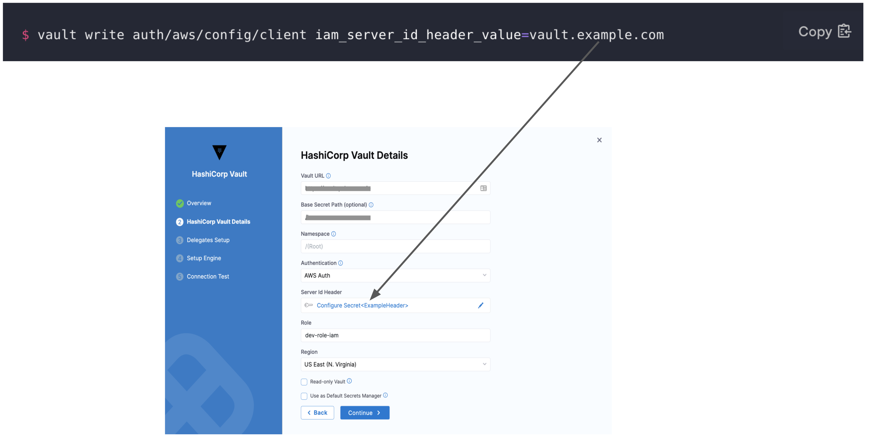 You must add the Server ID Header from Vault as a Harness Encrypted Text Secret and select it for Server Id Header in Harness.