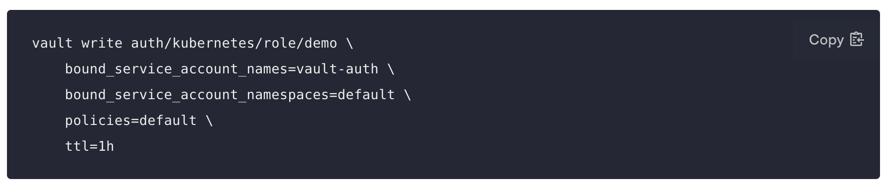 To authenticate with Kubernetes Auth, make sure you have created a role in the vault inside auth/kubernetes/role. This role authorizes the "vault-auth" service account in the default namespace and it gives it the default policy. This is also where you'll find the service account name and namespace that will be used to access the vault endpoint.