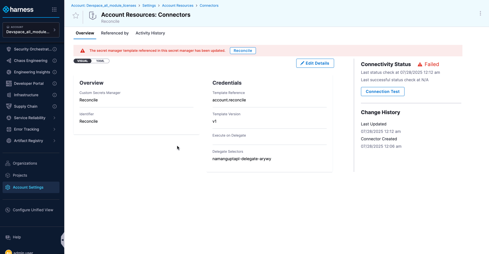After saving the template changes, Harness automatically identifies all dependent Custom Secret Managers and Secrets that need to be updated. Reconciliation alerts will appear on these entities to guide you through the update process.