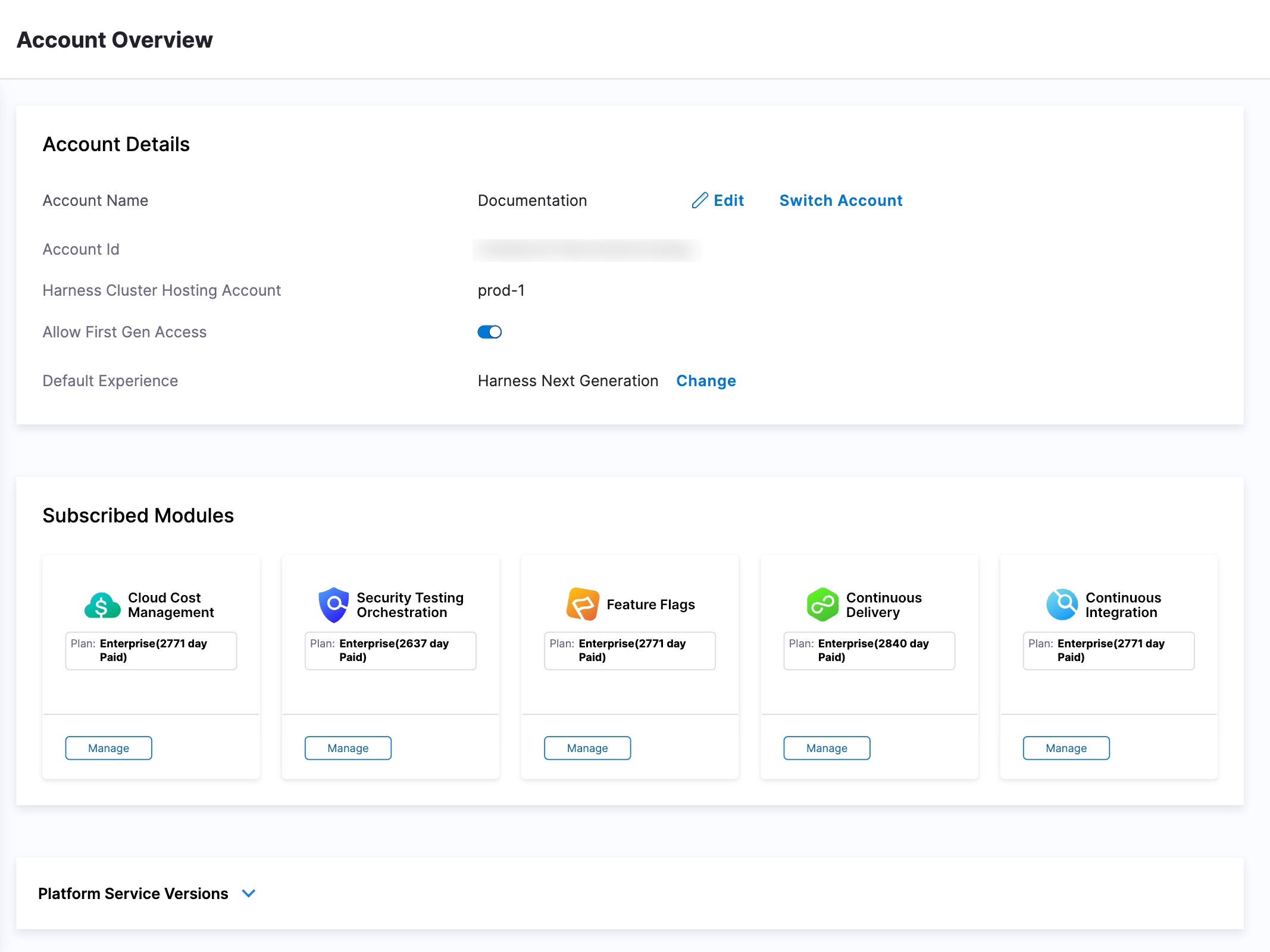 To get an overview of your Harness account, go to Account Settings. Under General, select Account Details to open the Account Overview page.