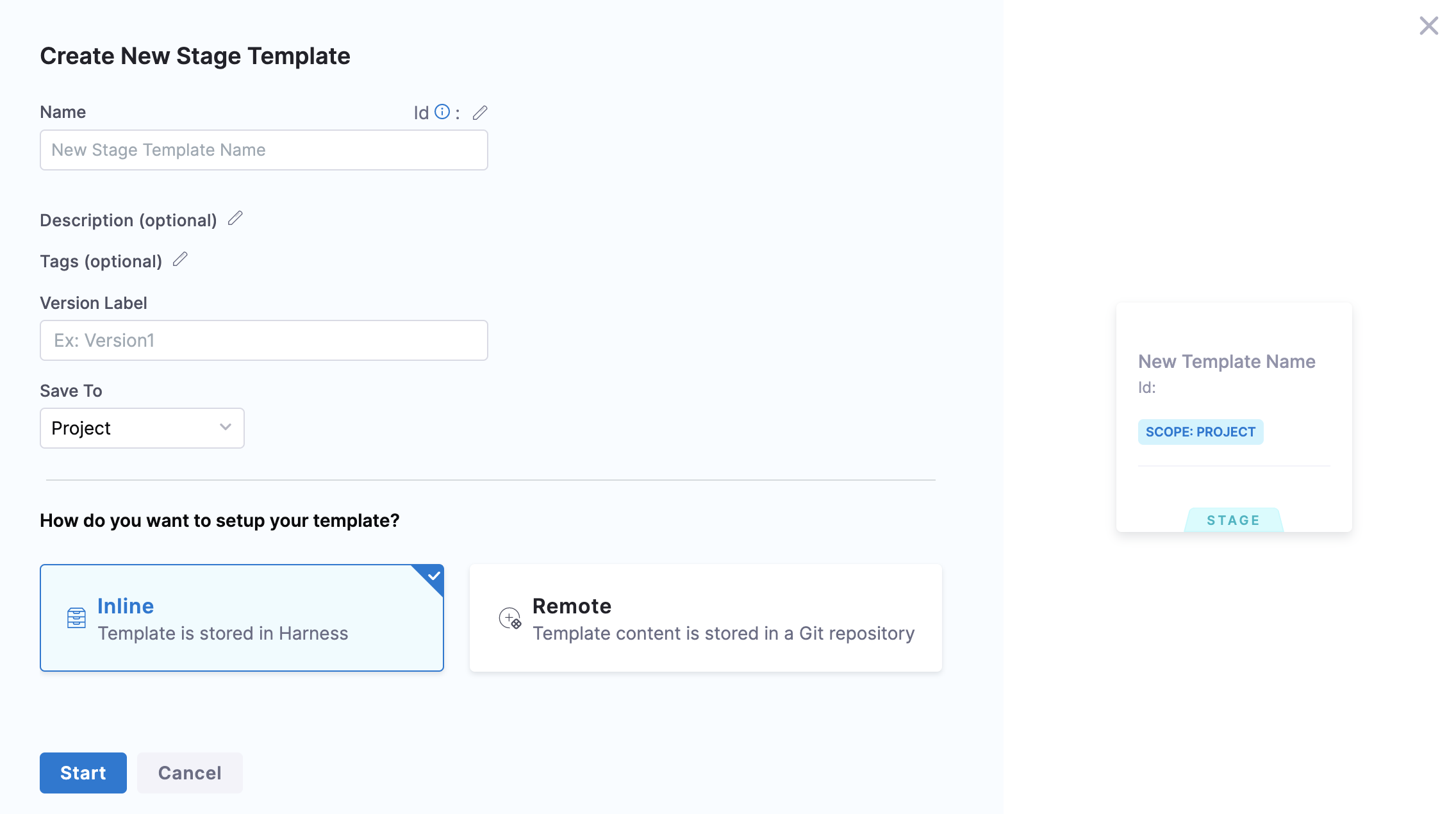 When you create a template, you can save it in Harness (Inline) or in a Git repository (Remote).