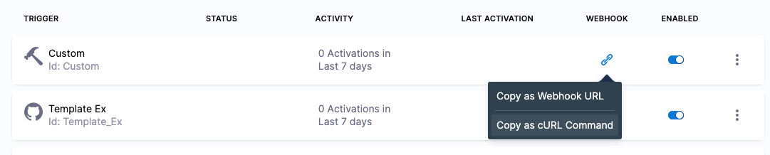 - On the Triggers page, in the Webhook column, select the link icon for your trigger and then select Copy as cURL Command.