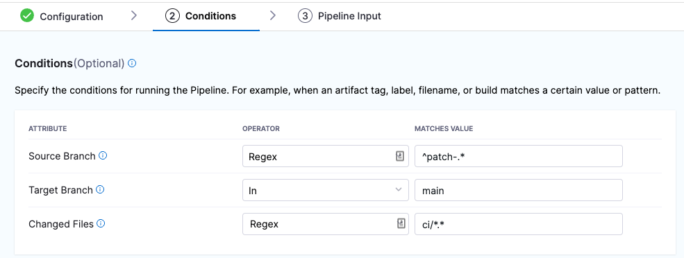 - Trigger a pipeline if the source or target branch in the Git event matches a specified pattern.