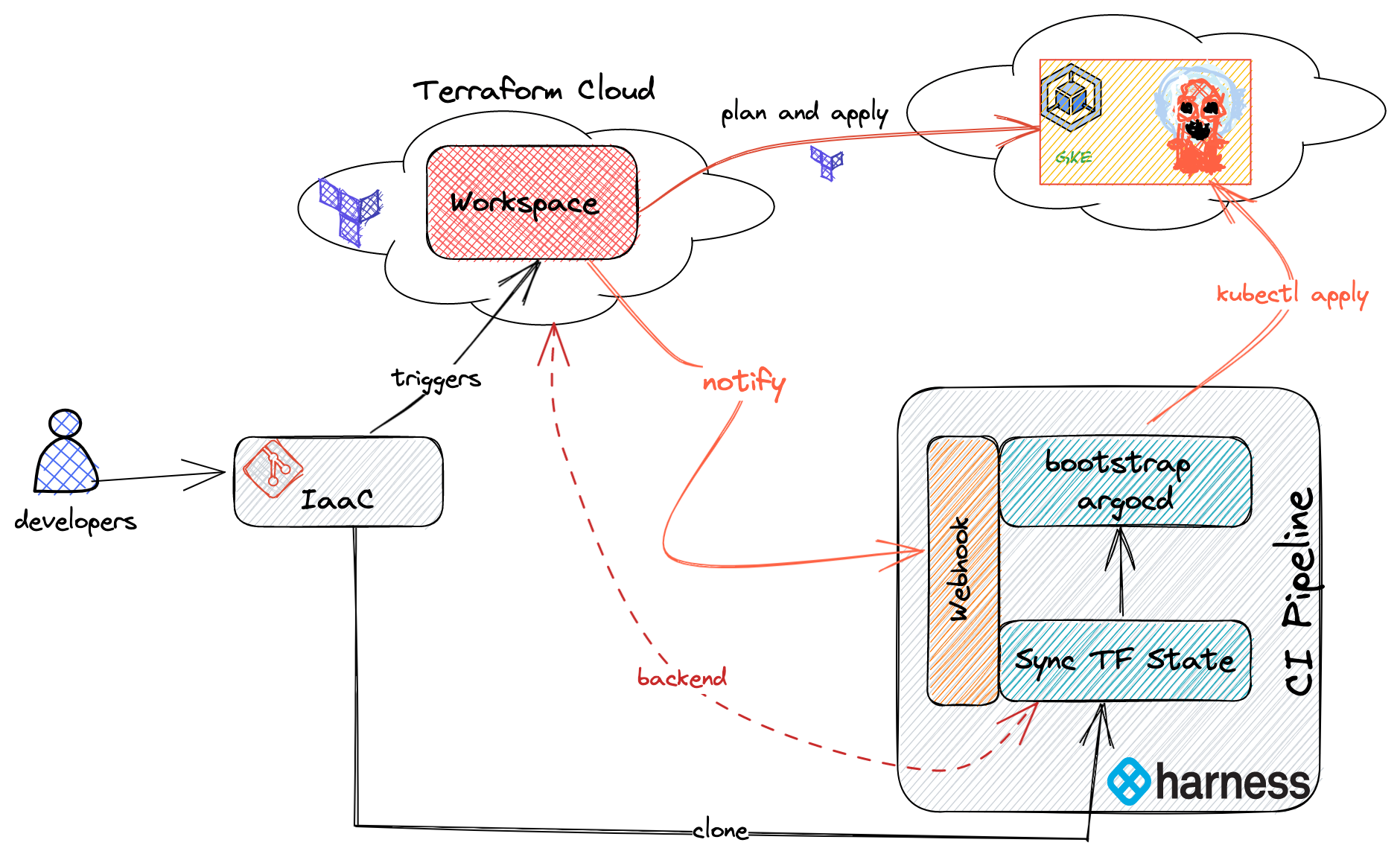 As CI/CD user, I want to provision a Kubernetes cluster on Google Cloud Platform (GKE) using Terraform. When the cluster is successfully provisioned, trigger a CI pipeline to start bootstrapping ArgoCD on to GKE.