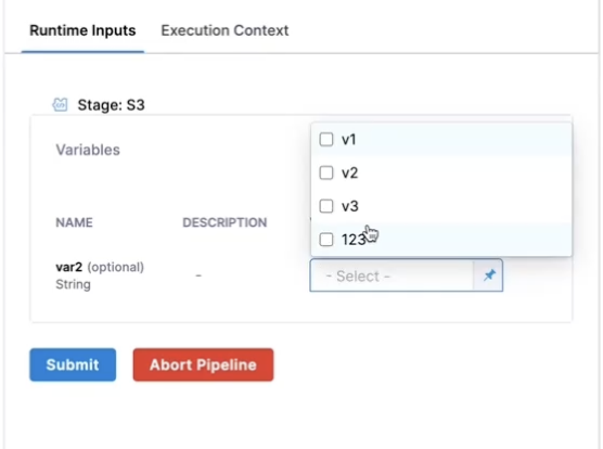 When the execution of the second stage (cust_2) starts, it will wait for the execution inputs. As shown, in var2, we have added allowed values as expressions, and those values have been converted into a list.