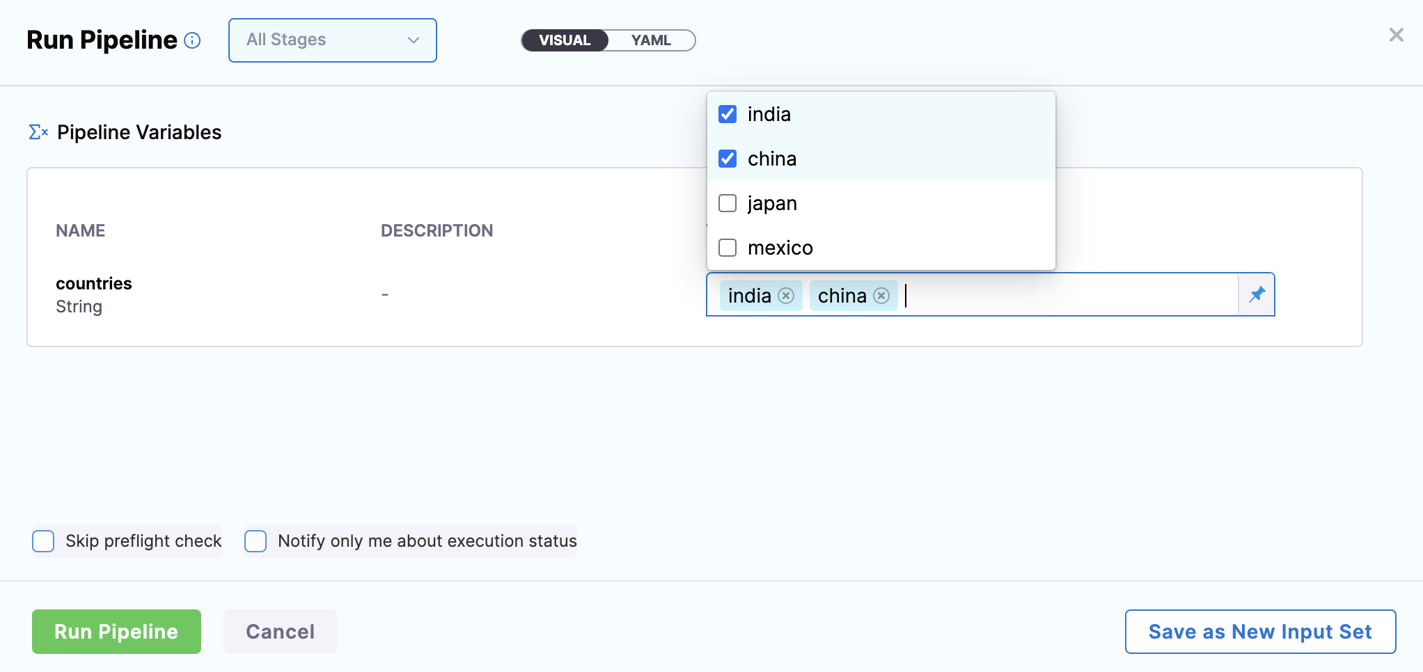 You can also create input sets and overlays to quickly populate runtime inputs with sets of preconfigured values. You can create input sets for different pipeline use cases, and then select the relevant input set at runtime.