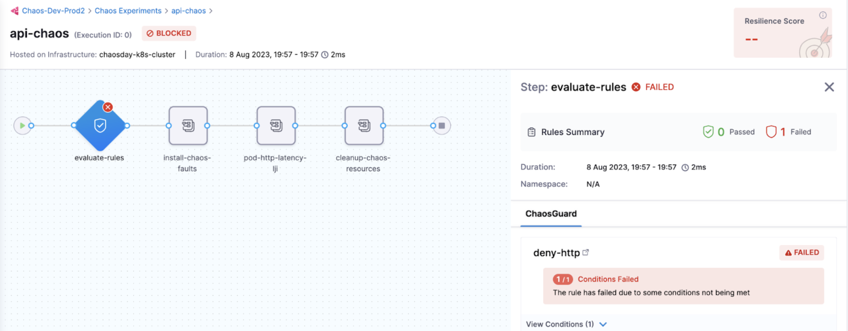 Below is a snap that shows a failed evaluation of some (or all) rules in a chaos experiment.