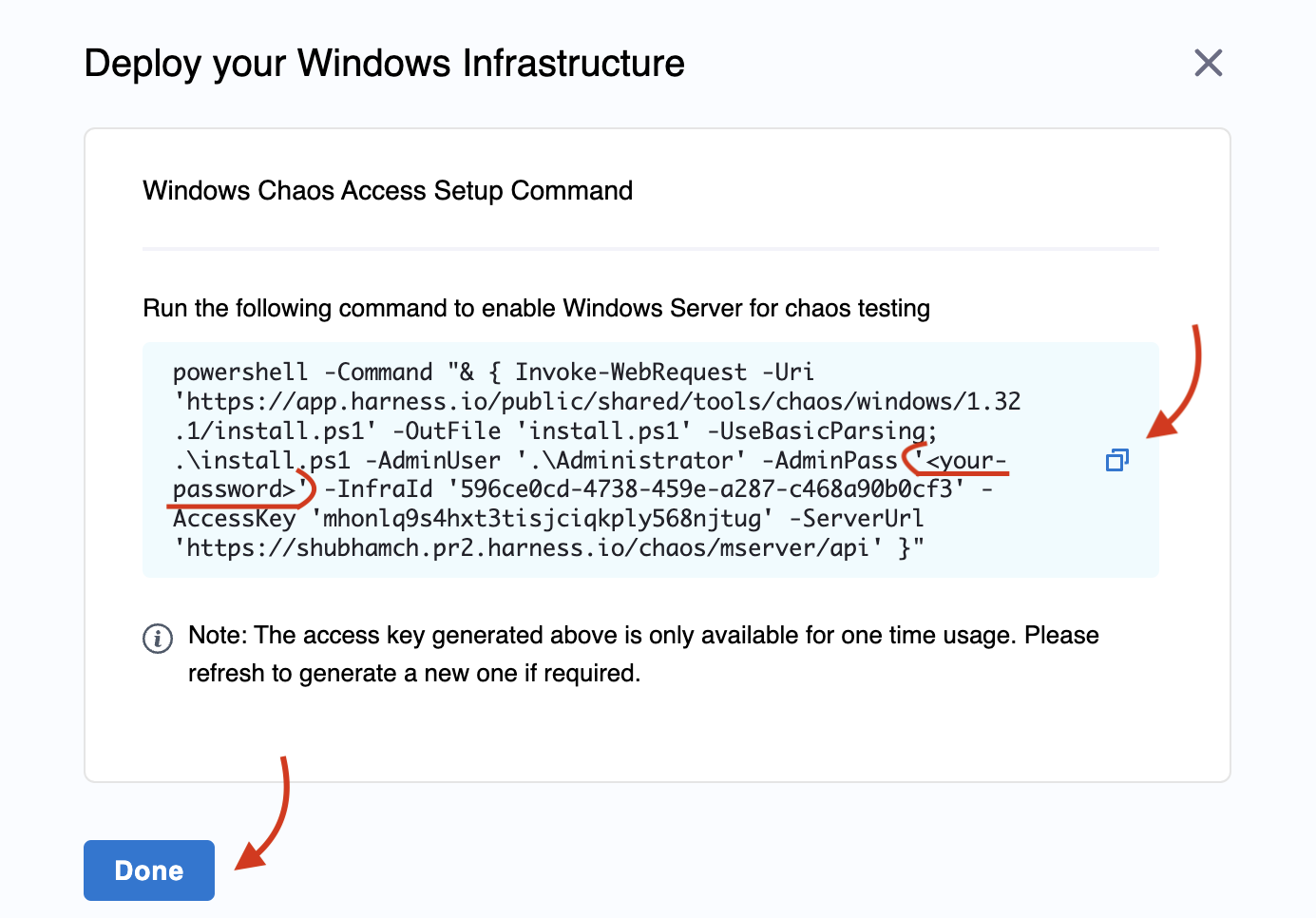 <your-password>placeholder. Execute this command on your terminal (remember to open the command prompt as an admin if you are not an admin by default). Click Done once you finish the execution.