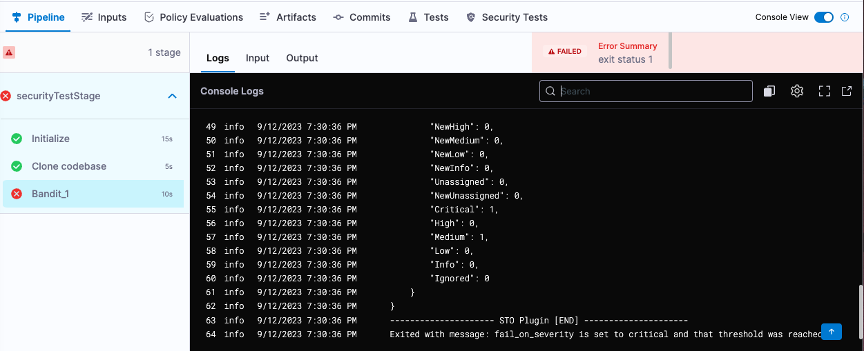The pipeline now fails because the Bandit step is now configured to fail on any critical vulnerability. The last log message in the Bandit step log is: