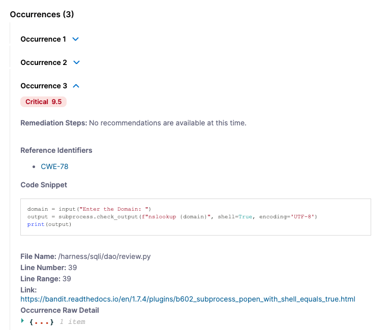 Many of the details you see for each issue are derived from the external scanner. These details can differ, depending on the scan tool you're using. In this tutorial we're using Bandit, which is a free, open-source scan tool. In general, paid scanners provide more extensive details (such as remediation steps) than free ones.