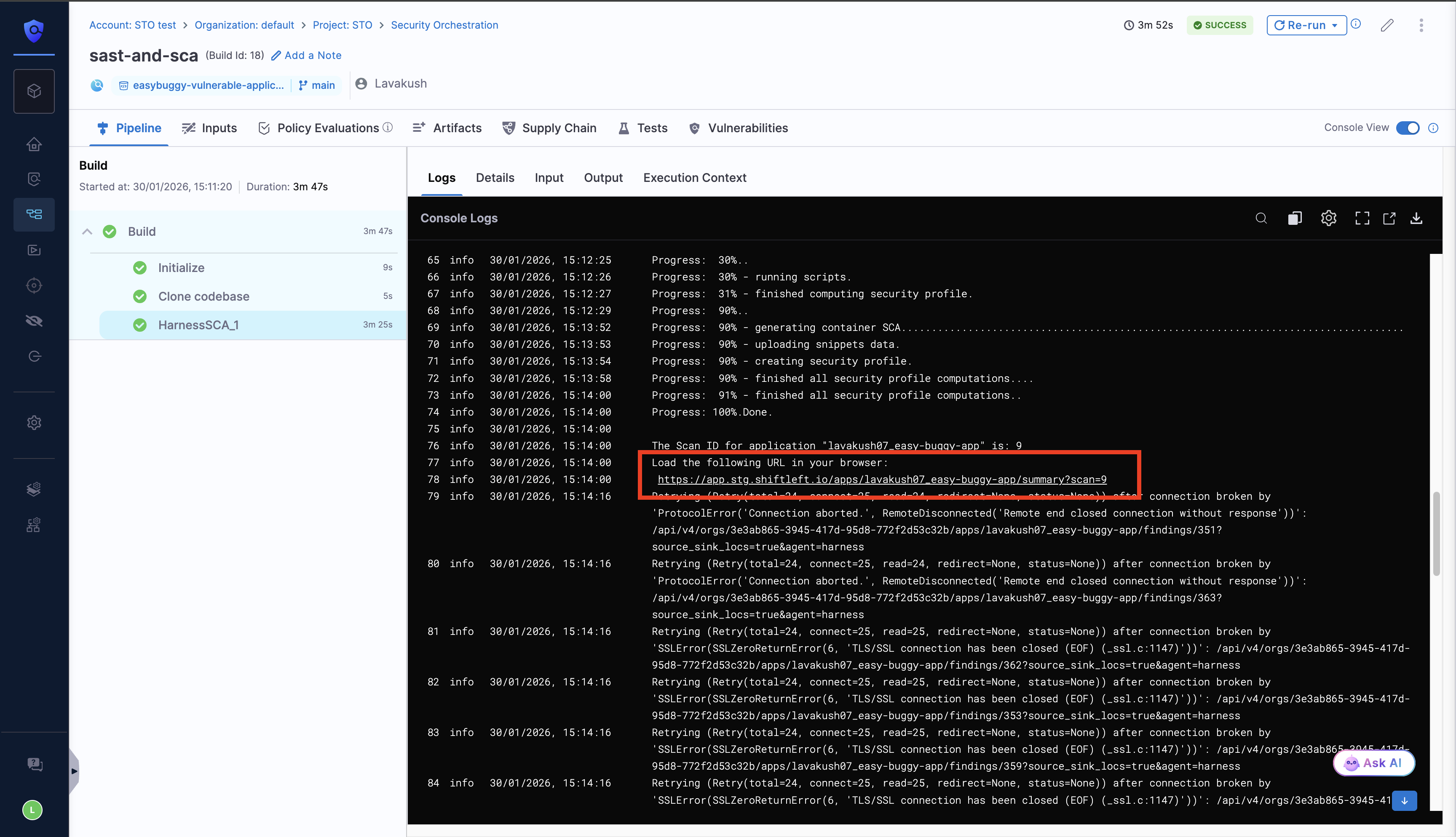 The SCA step works natively within STO, with all findings unified and visible alongside results from other security scanners.