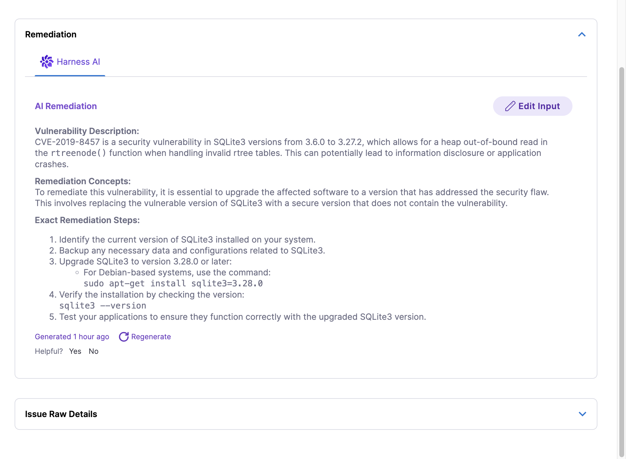 Harness AI analyzes security issues and provides AI remediation within the security details for each specific issue. This includes an analysis of the issue, remediation concepts, and step-by-step instructions to fix them. Additionally, for SCA issues, Harness AI recommends safer package versions for upgrade, with remediation details available for each occurrence of an issue.