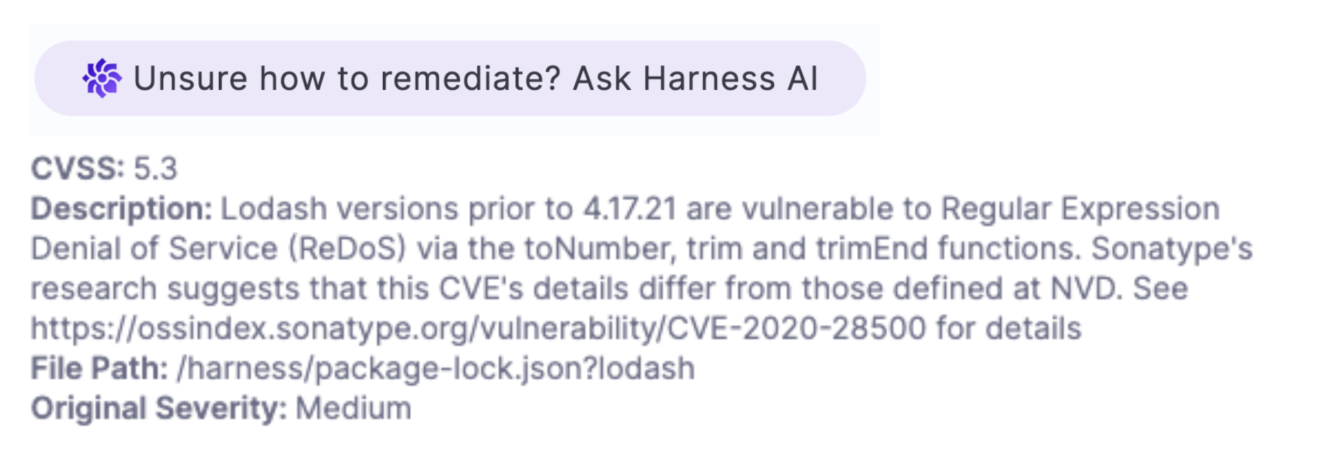 This suggested remediation is based on public information about the CVE or CWE and the first detected occurrence (Occurrence 1) in the target. If the scanner captures the code snippet where the vulnerability is occurring, the query to Harness AI includes this snippet as well.